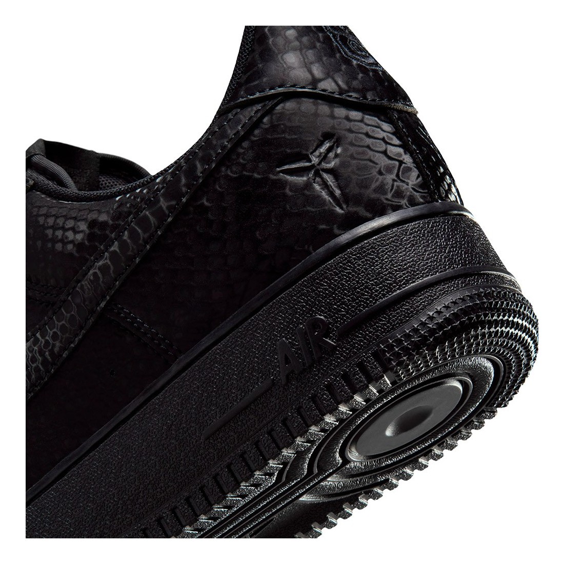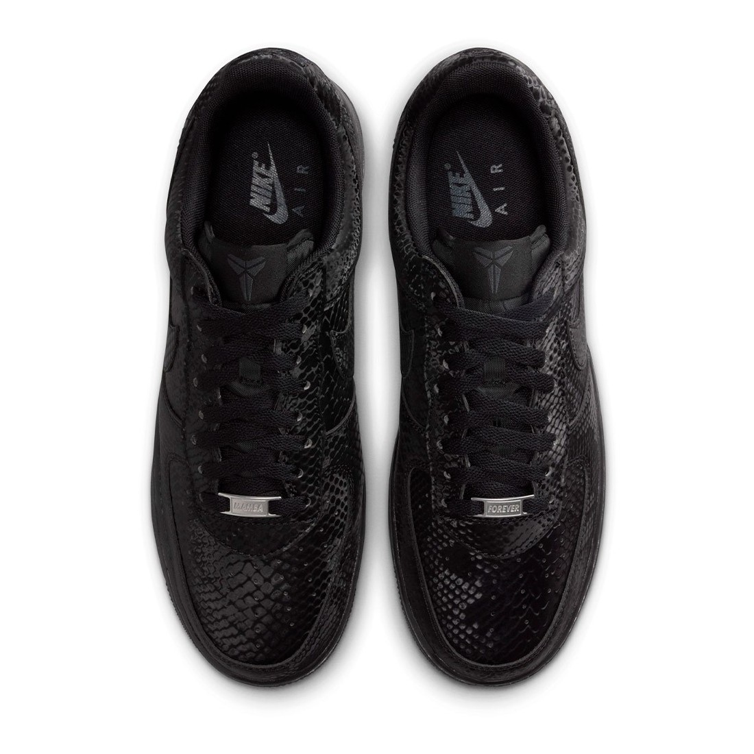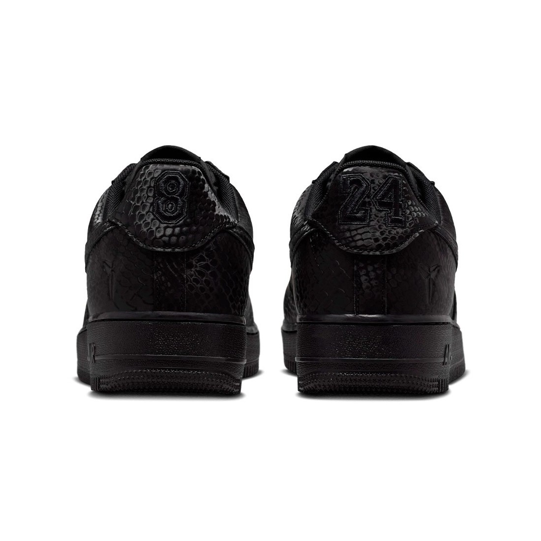 Air Force 1 Kobe Bryant Forever Black. Aquestes AF1 d'edició especial estan impregnades de l'ADN de Mamba, que es veu a l'estampat de pell de serp per tota la peça, per aportar un toc distintiu a un clàssic de sempre. Els números "8" i "24" brodats al taló reten homenatge als números de samarreta retirats de Kobe, alhora que els logotips Sheath a la llengüeta i la part exterior del taló afegeixen un toc exclusiu. Aquestes Kobe AF1 continuen el llegat del jugador amb xapes "Mamba Forever" especials als cordons.
