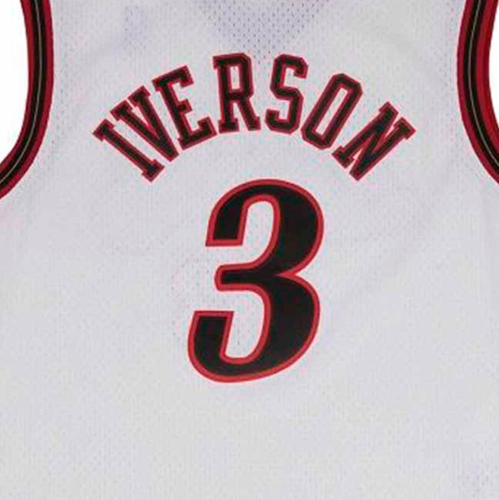 Allen Iverson Philadelphia 76ers 00-01 White Swingman. Aquesta samarreta de bàsquet d'Allen Iverson dels Philadelphia 76ers és de la temporada 00-01 de la NBA. Aquesta Hardwood Classics ofereix un estil vintage que ret homenatge a la samarreta que van usar els 76ers.