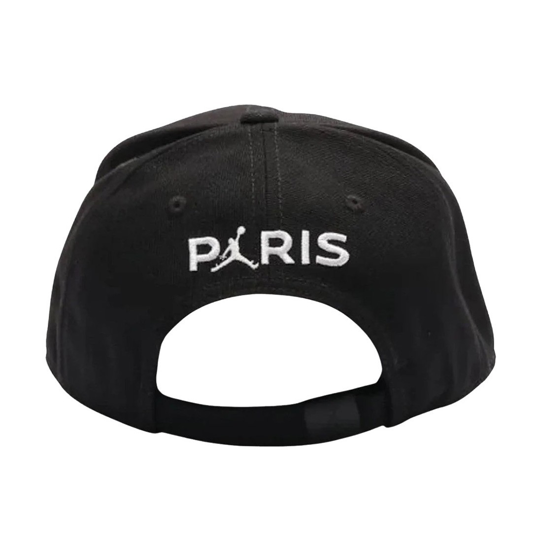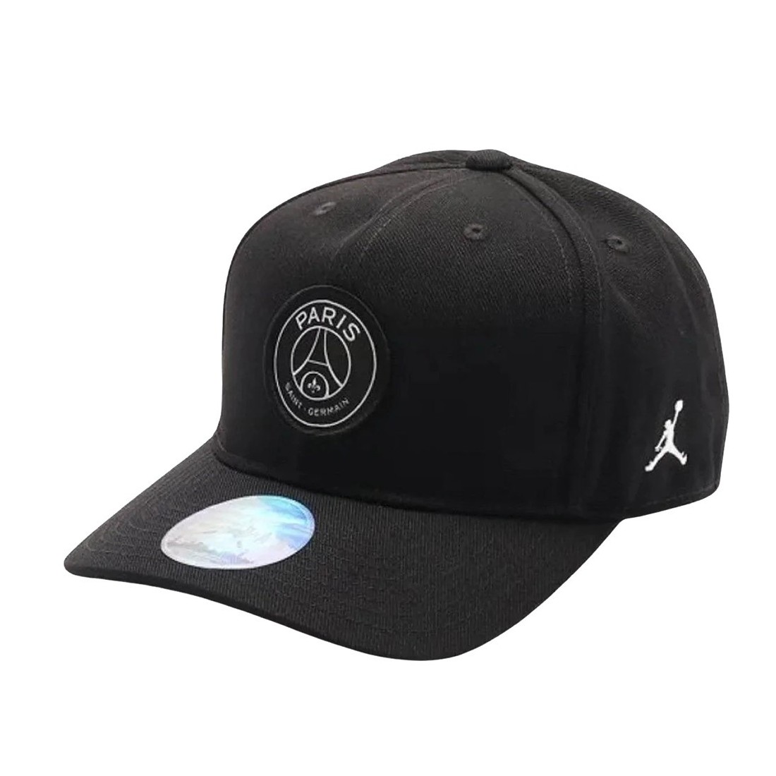 Gorra Junior Jordan PSG Black. Aquesta gorra Jordan dissenyada per a joves combina un perfil modern amb una construcció resistent. Està composta per un teixit ferm però flexible, que garanteix durabilitat fins i tot en ús diari. La visera estructurada aporta solidesa i forma, mentre que els traus afavoreixen la ventilació per mantenir la frescor. Inclou un tancament del darrere ajustable que permet adaptar la talla amb facilitat, assegurant un ajust còmode i segur. A la part davantera, destaca un pegat amb el logotip Jumpman i l'escut del PSG, fet que aporta un caràcter emblemàtic i reconeixible. El disseny depurat i minimalista la fa molt versàtil: s'adapta tant a estils urbans com esportius.