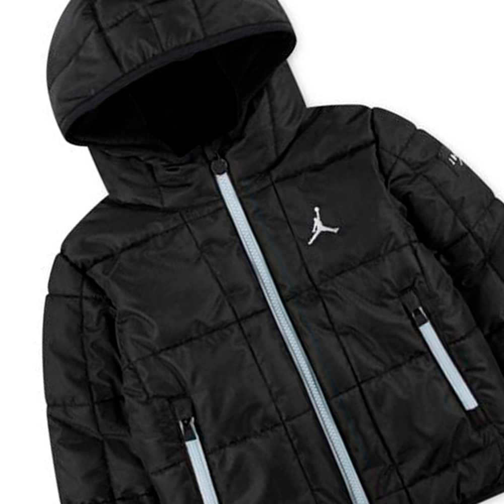 Jaqueta Jordan Essential Midweight Puffer Black. La jaqueta júnior Jordan és una peça ideal per mantenir l'estil i la comoditat els dies més frescos. Confeccionada amb materials resistents i un interior suau, proporciona abric sense renunciar a la llibertat de moviment. El seu disseny amb cremallera completa permet posar-la i treure fàcilment, mentre que les butxaques laterals afegeixen funcionalitat. El logotip Jordan destaca al pit, aportant un look esportiu i modern perfecte per als joves fans del bàsquet.