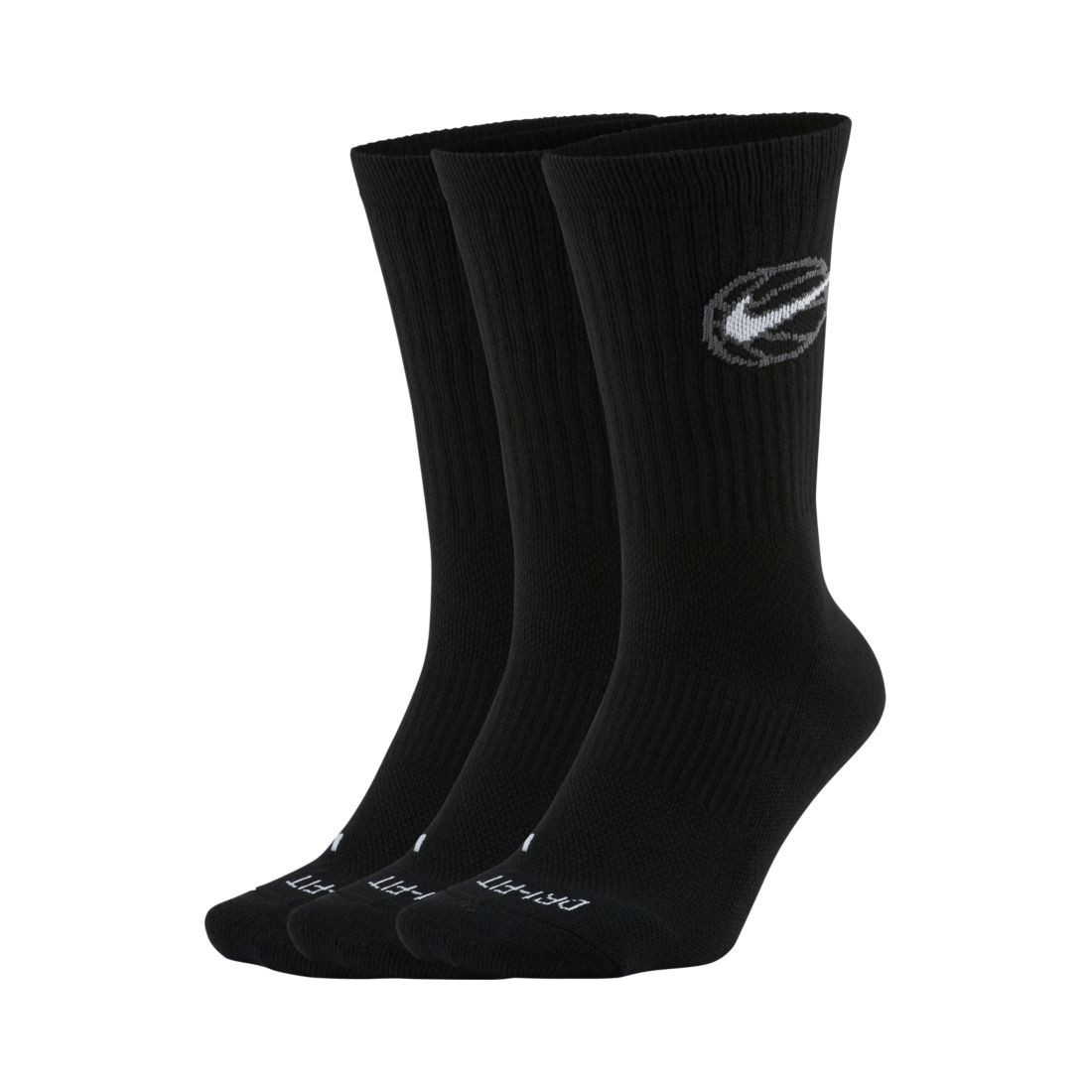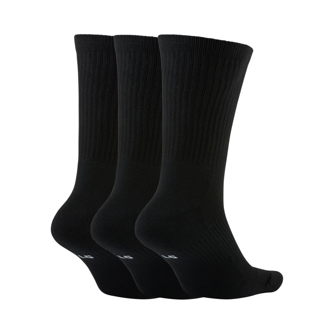 Mitjons Nike Everyday Crew Black Socks (3 Parell). Aquest pack de 3 parells de mitjons Nike de color negre t'ofereixen un amortiment a la planta de el peu que proporciona comoditat a la pista, i la banda elàstica al pont de el peu t'envolta per oferir subjecció.