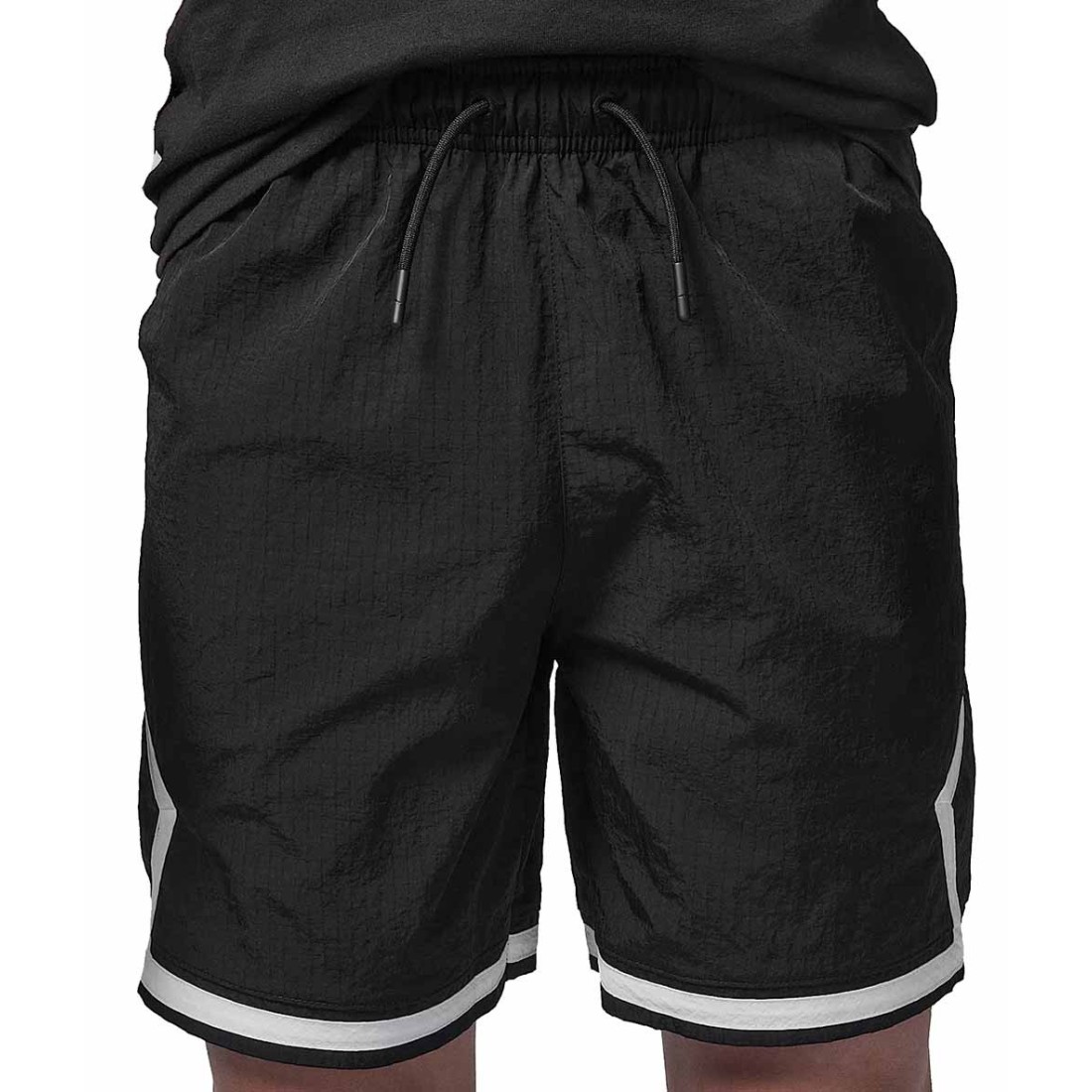 Pantalons Junior Jordan Woven Diamond Black. La versió júnior d'aquests pantalons jordan està fabricada amb un teixit ripstop de niló lleuger, dissenyat per oferir una gran durabilitat sense sacrificar frescor en dies càlids. Compte amb cintura elàstica amb cordó ajustable que assegura un ajust còmode i adaptable al creixement, a més de butxaques laterals funcionals on guardar claus, mòbil o petits objectes. Amb un branding Jumpman discret i un patró tipus “diamond”, aquests pantalons curts combinen estil modern, funcionalitat i la qualitat reconeguda de la marca Jordan.