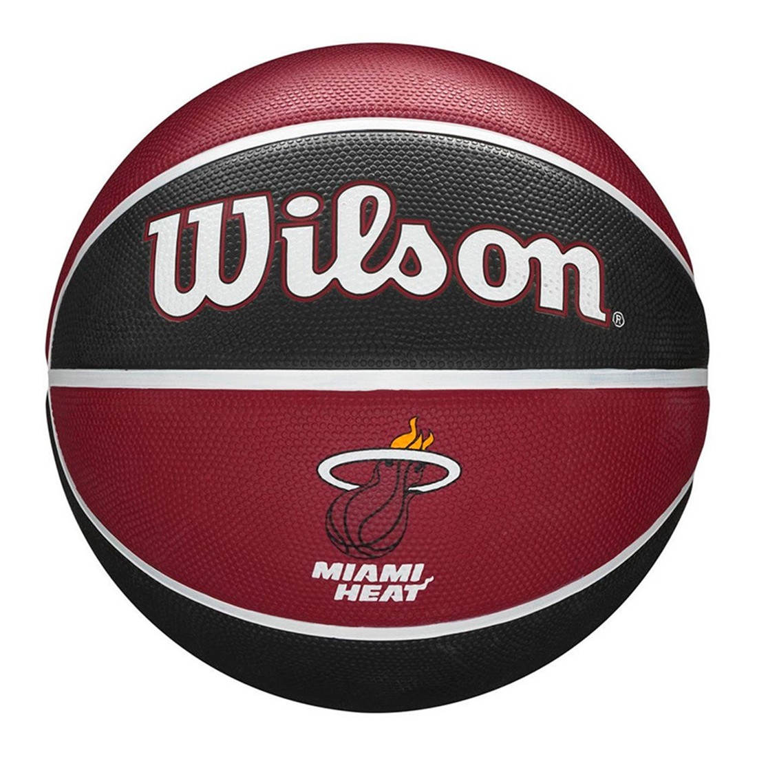 Pilota Wilson GS Miami Heat NBA Team Tribute Basketball. Aquesta pilota de bàsquet Wilson presenta un patró altern dels colors primaris i secundaris de l'equip als seus panells de superfície, i destaca el logotip de la franquícia NBA de manera prominent. La Performance Cover està dissenyada per enfrontar-se a qualsevol pista que triï, construïda amb una subjecció duradora per a superfícies rugoses. Talla 7.