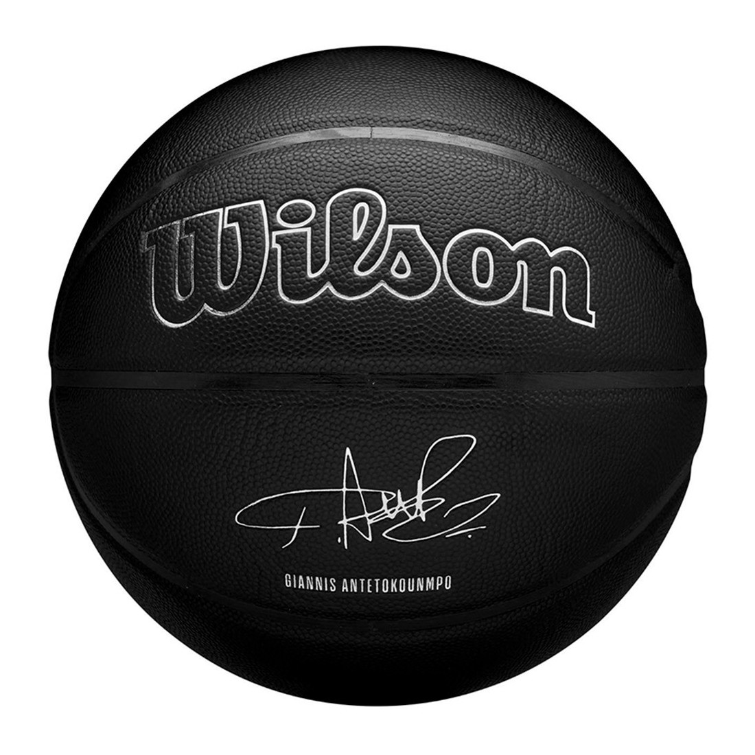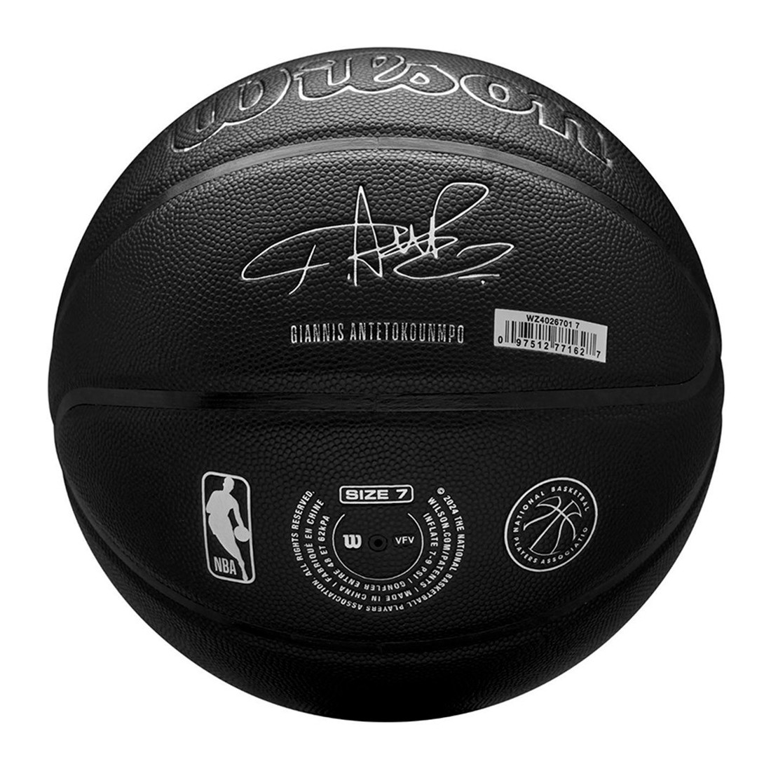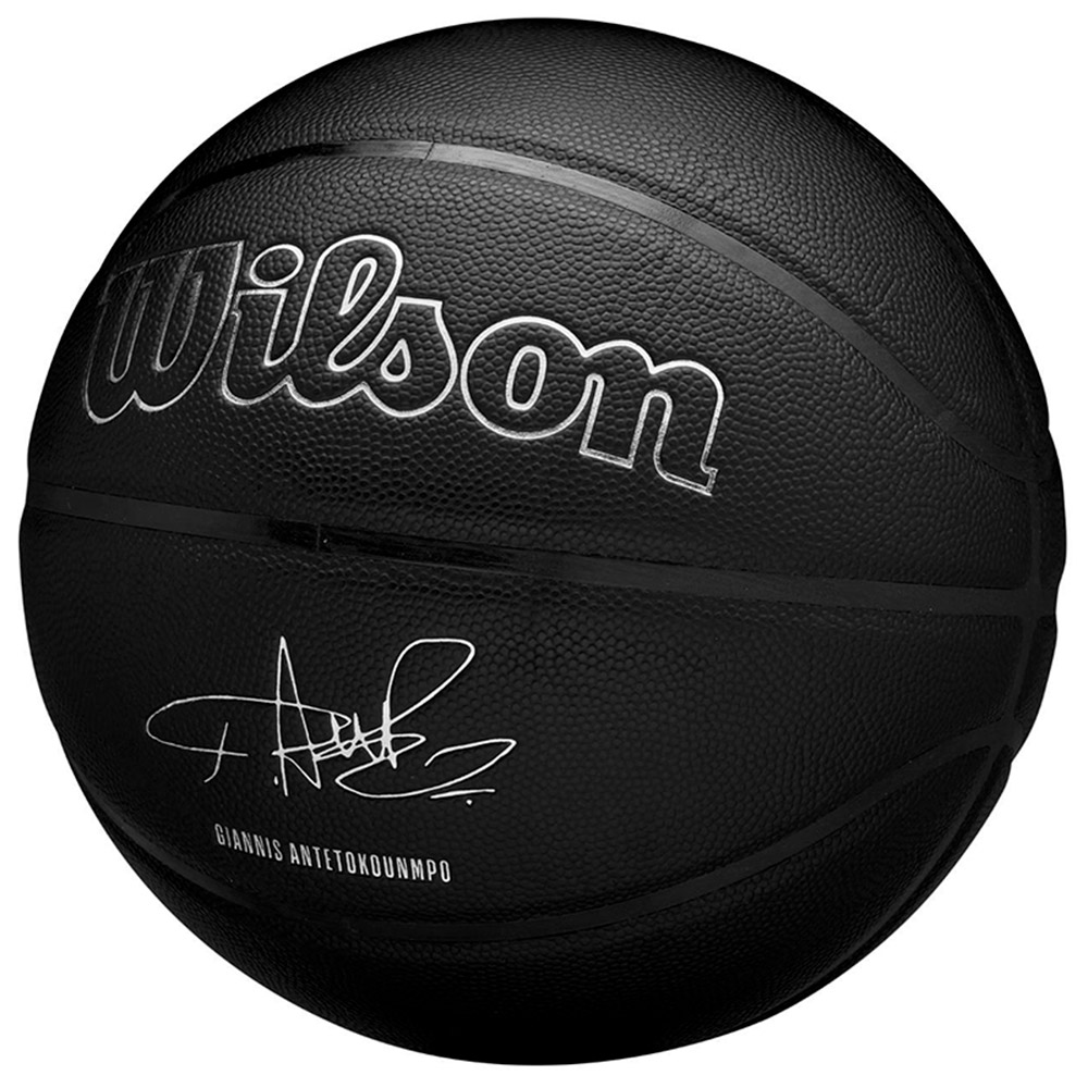 Pilota Wilson NBA Player Evergreen Giannis Antetokounmpo Sz 7. De tant en tant, un jugador arriba a la lliga que revoluciona el joc. Celebra la creativitat i l'habilitat d'un dels millors jugadors de tots els temps amb la pilota de bàsquet Wilson NBA Player Nightmode. L'elegant funda negra Pure Feel està adornada amb una signatura platejada i el nom del teu jugador preferit.