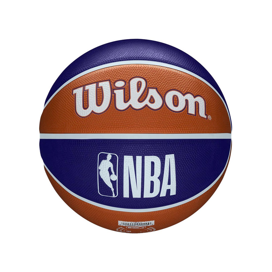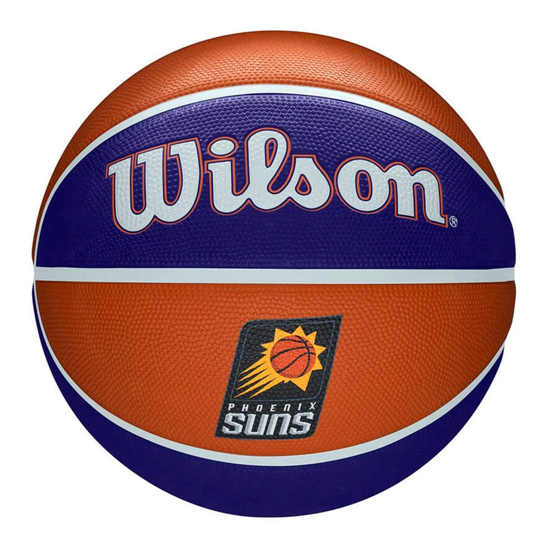 Pilota Wilson Phoenix Suns NBA Team Tribute Basketball. Aquesta pilota de bàsquet Wilson dels Phoenix Suns presenta un patró altern dels colors primaris i secundaris de l'equip en els seus panells de superfície, i destaca el logotip de la franquícia NBA de manera prominent. La Performance Cover està dissenyada per enfrontar-se a qualsevol pista que triï, construïda amb una adherència durador per a superfícies rugoses. Talla 7.