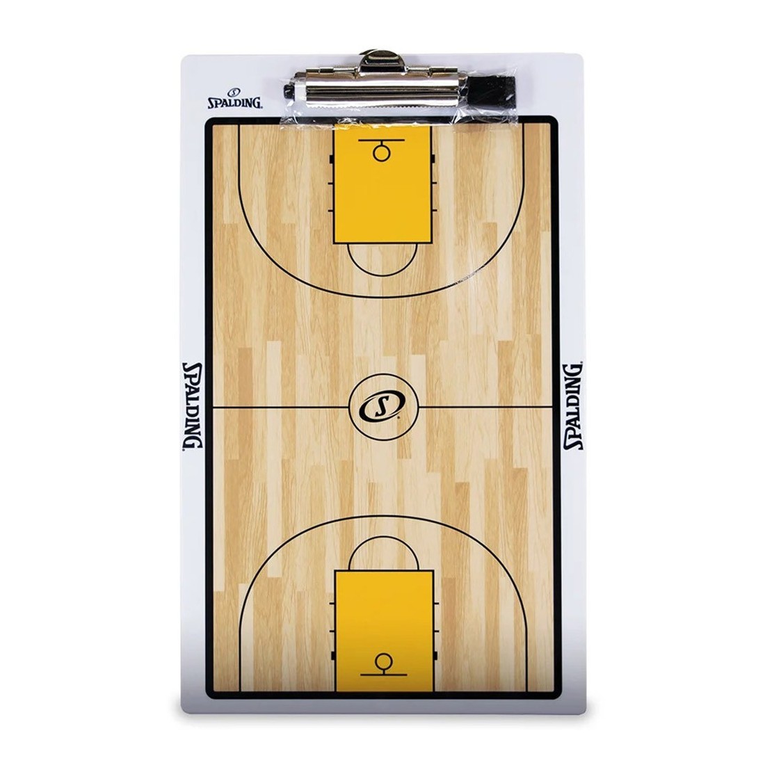 Pissarra Spalding Two Sides Metallic Clip. Aquesta pissarra tàctica de Spalding està dissenyada per a entrenadors que necessiten comunicar estratègies de manera clara i eficient. Té dues cares metàl·liques que permeten dibuixar amb retolador d'esborrat en sec, oferint flexibilitat a la planificació de jugades. Incorpora un clip metàl·lic a la vora superior per subjectar blocs o apunts, cosa que facilita l'anotació d'idees o estadístiques durant entrenaments o partits. La seva estructura és robusta però lleugera, ideal per transportar a la banqueta o portar al maletí de l'entrenador. Les línies serigrafiades representen un camp de bàsquet estàndard, cosa que ajuda a recrear esquemes realistes. La superfície admet esborrat freqüent sense deteriorar-se, i l'acabat metàl·lic garanteix durabilitat a llarg termini. Aquesta eina tàctica millora la comunicació amb lequip i facilita la visualització de moviments clau amb un disseny professional.