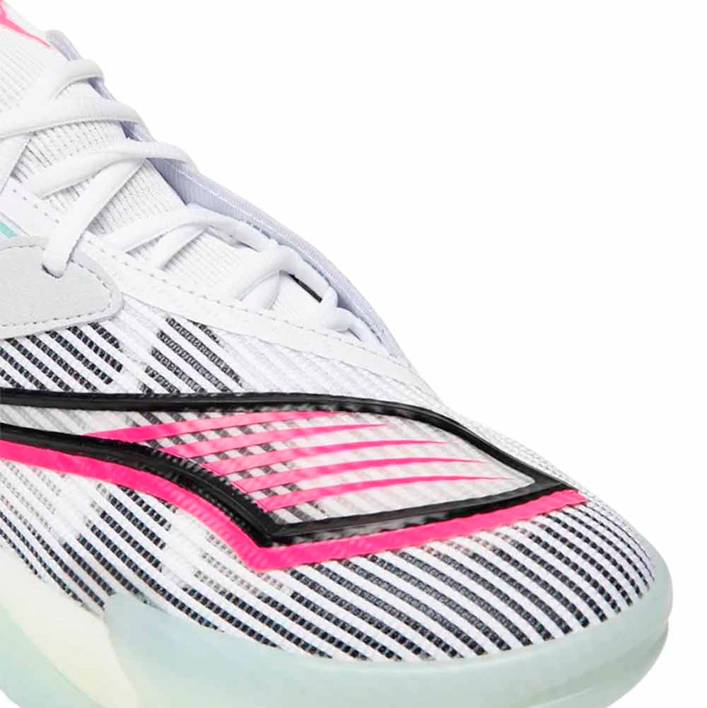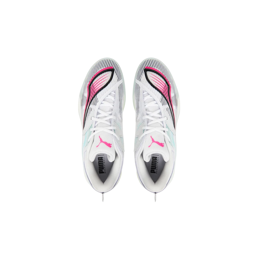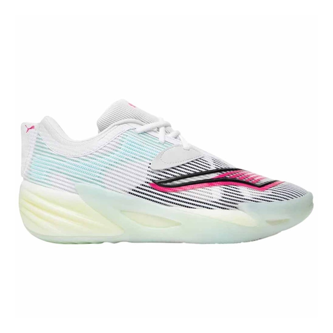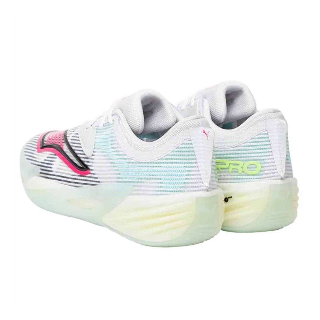 Puma All Pro Nitro 2 White Mint Melt. Les Puma All-Pro NITRO 2 són sabatilles de bàsquet d'alt rendiment dissenyades per al joc ràpid. Incorporen escuma NITRO SQD, que fusiona amortiment reactiva i estabilitat lateral en un sol sistema, mentre que la seva entresola ferma ofereix suport durant canvis de direcció intensos. La part superior utilitza PWR Print, una malla ultralleugera i estructurada que proporciona subjecció sense comprometre la ventilació.