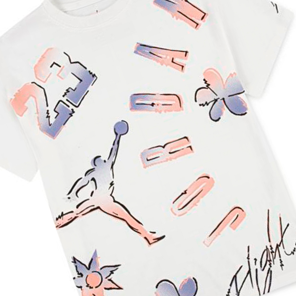 Samarreta Junior Jordan 23 Throwback Sail. Aquesta samarreta júnior Jordan ofereix un equilibri perfecte entre estil urbà i comoditat esportiva. Aquesta peça està dissenyada per acompanyar el ritme actiu del dia a dia, ja sigui a la pista, al pati o al parc. La seva cort regular proporciona llibertat de moviment, mentre que els gràfics inspirats en el llegat Jordan aporten un toc únic i ple d'actitud. És una samarreta lleugera, versàtil i perfecta per combinar amb altres peces esportives o casuals.