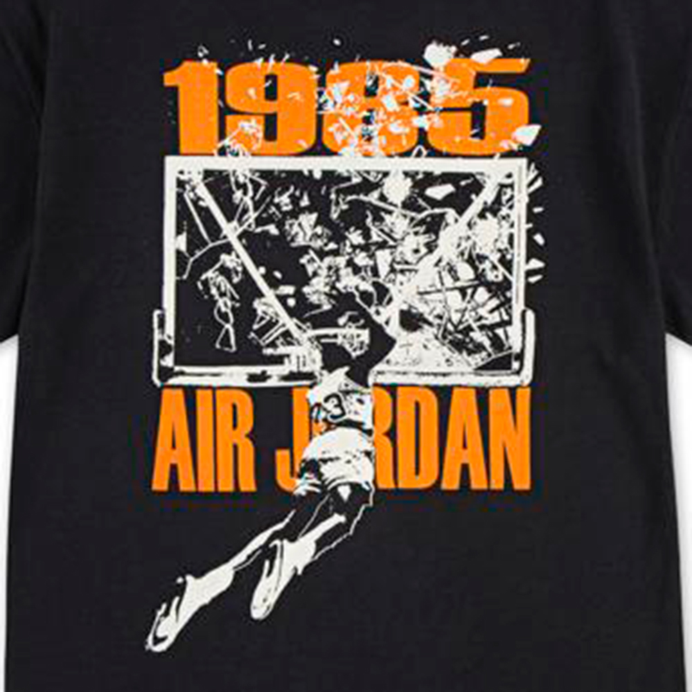 Samarreta Junior Jordan 85 Shatter Off Noir. Aquesta samarreta júnior Jordan ofereix un equilibri perfecte entre estil urbà i comoditat esportiva. Aquesta peça està dissenyada per acompanyar el ritme actiu del dia a dia, ja sigui a la pista, al pati o al parc. La seva cort regular proporciona llibertat de moviment, mentre que els gràfics inspirats en el llegat Jordan aporten un toc únic i ple d'actitud. És una samarreta lleugera, versàtil i perfecta per combinar amb altres peces esportives o casuals.