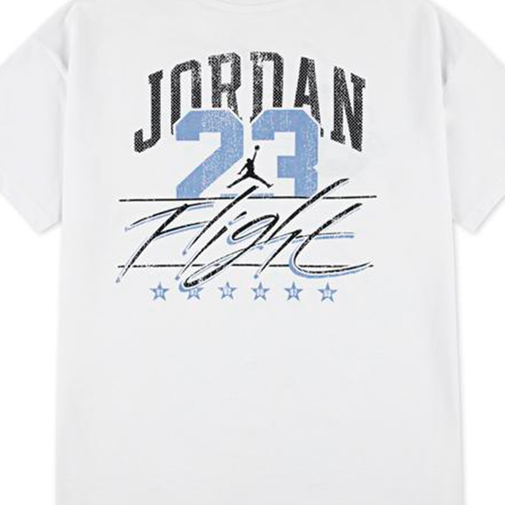 Samarreta Junior Jordan Distressed Colligiate White. Aquesta samarreta júnior Jordan ofereix un equilibri perfecte entre estil urbà i comoditat esportiva. Aquesta peça està dissenyada per acompanyar el ritme actiu del dia a dia, ja sigui a la pista, al pati o al parc. La seva cort regular proporciona llibertat de moviment, mentre que els gràfics inspirats en el llegat Jordan aporten un toc únic i ple d'actitud. És una samarreta lleugera, versàtil i perfecta per combinar amb altres peces esportives o casuals.