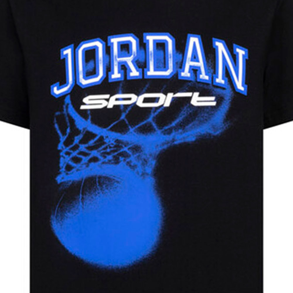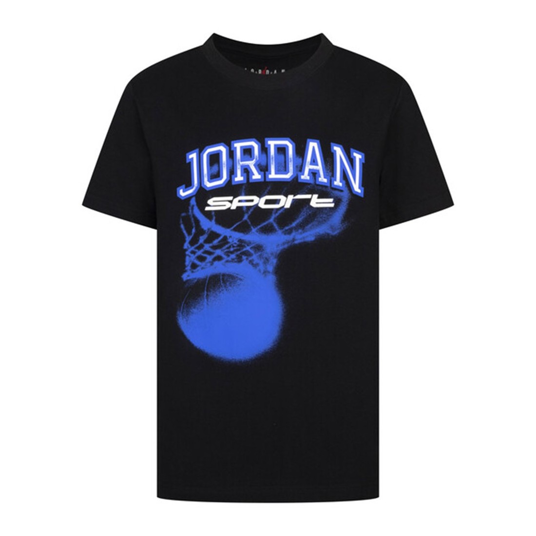Samarreta Junior Jordan Sport Hoop Black. Aquesta samarreta júnior Jordan és una peça dissenyada per als petits aficionats amb estil i comoditat. Confeccionada en una suau barreja teixits, ofereix lleugeresa i frescor per a l'ús diari oa l'esbarjo. S´acompanya d´un gràfic central que reflecteix l´estètica moderna i el llegat de la marca Jordan. El coll rodó i el tall estàndard garanteixen un ajustament relaxat, ideal per moure's amb total llibertat.