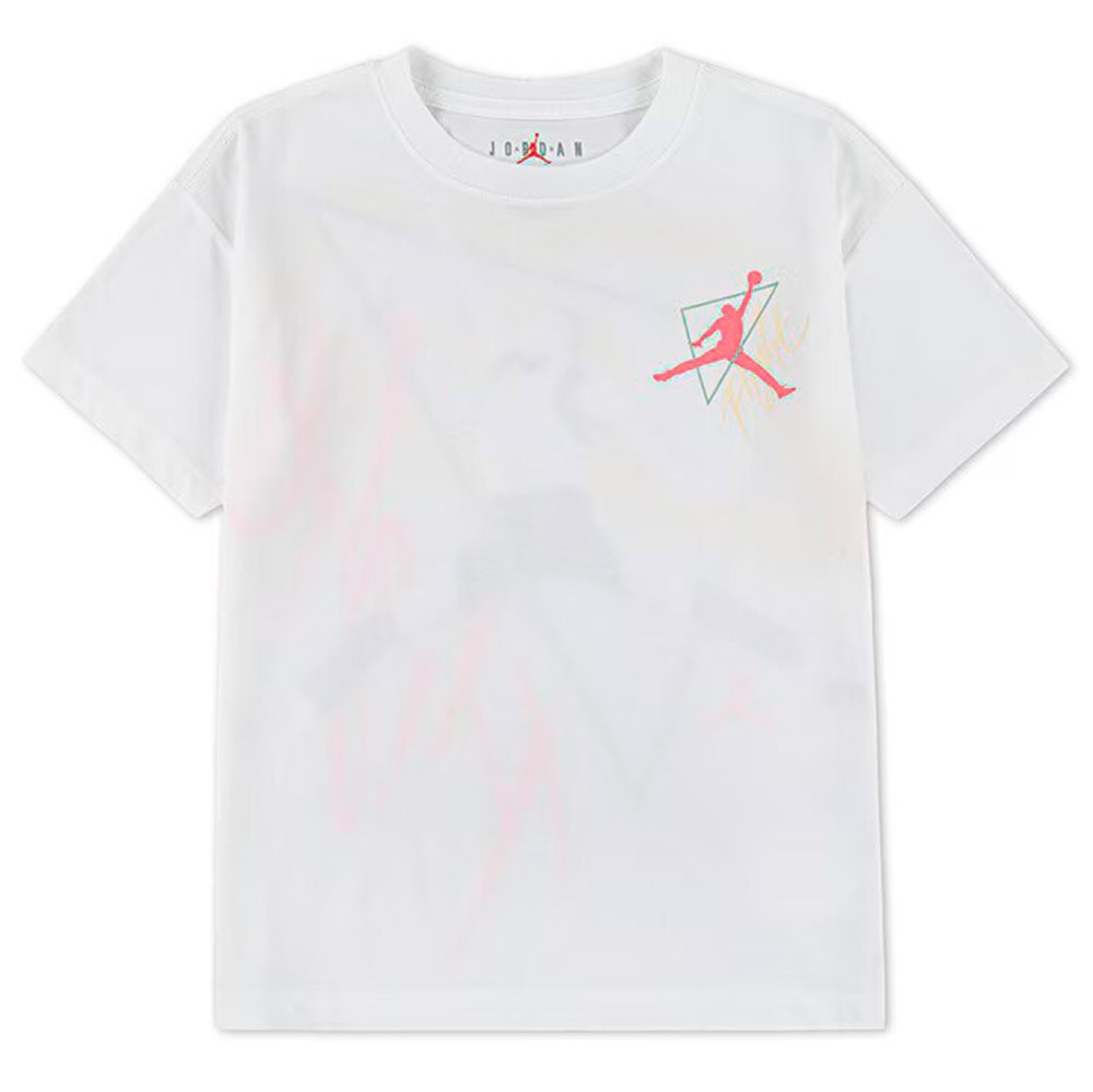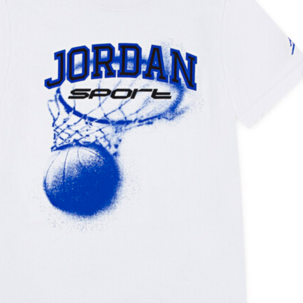 Samarreta Junior Jordan Sport Hoop White. Aquesta samarreta júnior Jordan és una peça dissenyada per als petits aficionats amb estil i comoditat. Confeccionada en una suau barreja teixits, ofereix lleugeresa i frescor per a l'ús diari oa l'esbarjo. S´acompanya d´un gràfic central que reflecteix l´estètica moderna i el llegat de la marca Jordan. El coll rodó i el tall estàndard garanteixen un ajustament relaxat, ideal per moure's amb total llibertat.