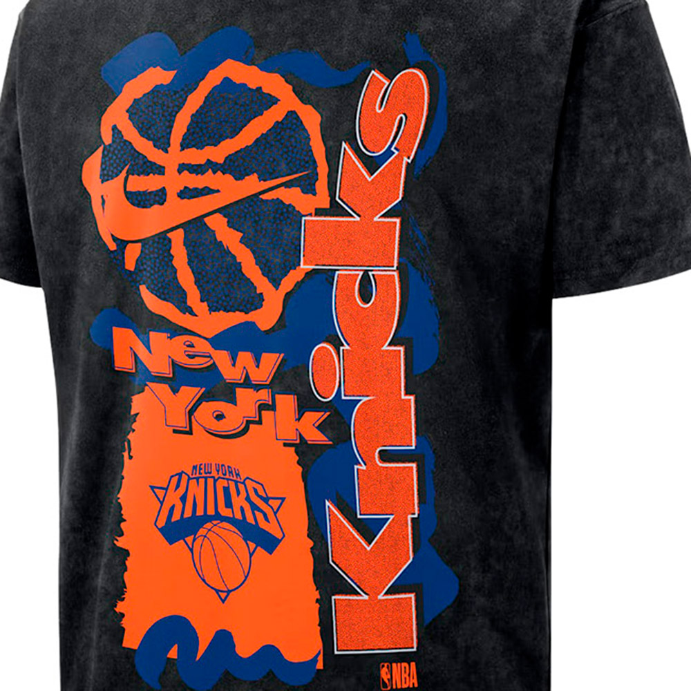 Samarreta Junior New York Knicks Max90 Black. Anima el teu equip preferit en qualsevol moment i lloc gràcies a aquesta samarreta de cotó de màniga curta. Té un coll rodó i lleugerament elàstic per facilitar-ne el lloc. El gràfic frontal estampat és molt original i representatiu que et farà no passar inadvertit.