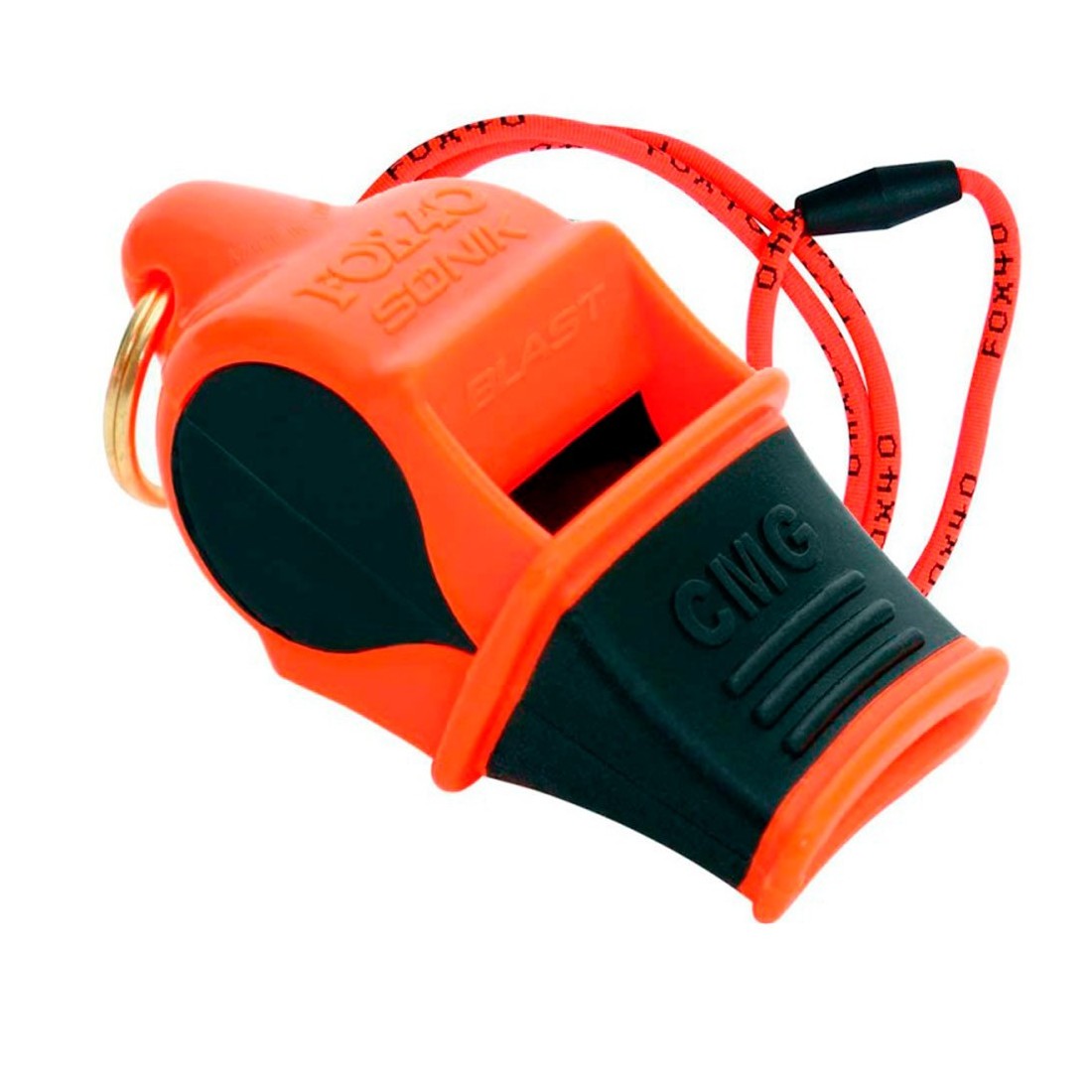 Xiulet Fox 40 Sonik Blast CMG Orange Black. El Fox40 Sonik Blast CMG és un xiulet professional sense bola dissenyat per oferir un so potent i clar en qualsevol condició. Amb la seva tecnologia patentada de doble càmera i quatre ressonadors, produeix un xiulet de 120dB, audible a grans distàncies, fins i tot en ambients sorollosos oa l'aire lliure. Fabricat en plàstic ABS d'alta resistència, és impermeable, no es congela ni s'encalla per brutícia, oferint fiabilitat total. Inclou el còmode CMG® Cushioned Mouth Grip, que protegeix els llavis i millora la subjecció, juntament amb un cordó o anella metàl·lica per a un transport senzill.