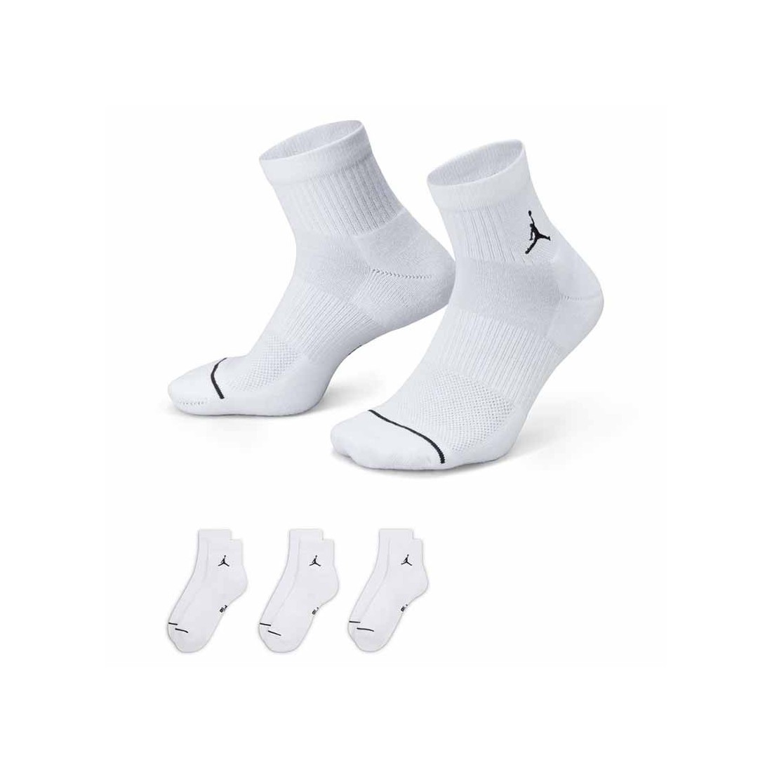 <p><strong>Calcetines Jordan Everyday White Ankle Socks (3P)</strong>. Estos calcetines Jordan hasta el tobillo mantienen la transpirabilidad y la frescura gracias al tejido con capilarización del sudor y los paneles transpirables en los tobillos. Te ofrecen un ajuste ceñido en el puente del pie para una mayor sujeción.</p>