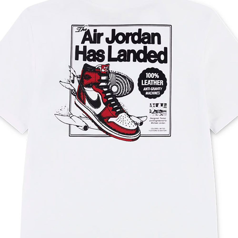 Camiseta Junior Jordan Has Landed White. Nos remontamos al lanzamiento original de las AJ1 con una camiseta de algodón suave de densidad media que rinde homenaje a las zapatillas que apodamos "máquinas antigravedad".