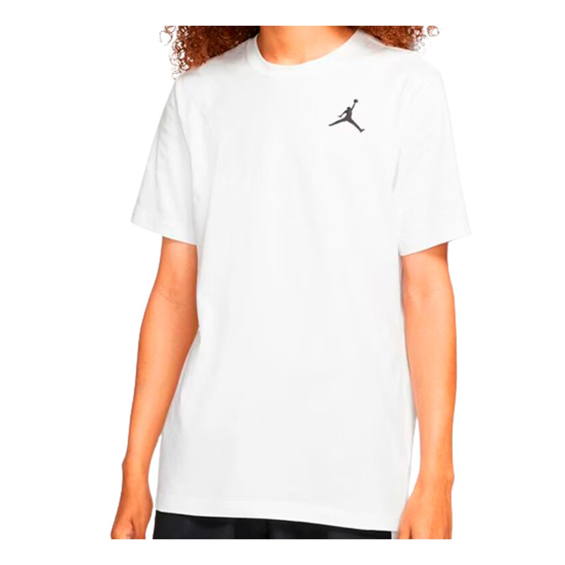 Camiseta Junior Jordan Jumpman Dri-FIT White. Esta camiseta de alto rendimiento es un diseño clásico de manga corta confeccionado con tela entrelazada de tejido Knit mejorada con tecnología Dri-FIT que se seca rápidamente para mantener la frescura y la transpirabilidad mientras lo das todo en el gimnasio, cuando juegas o te diviertes con amigos.