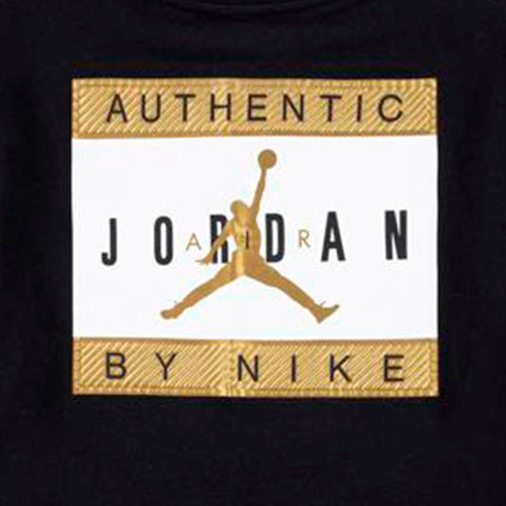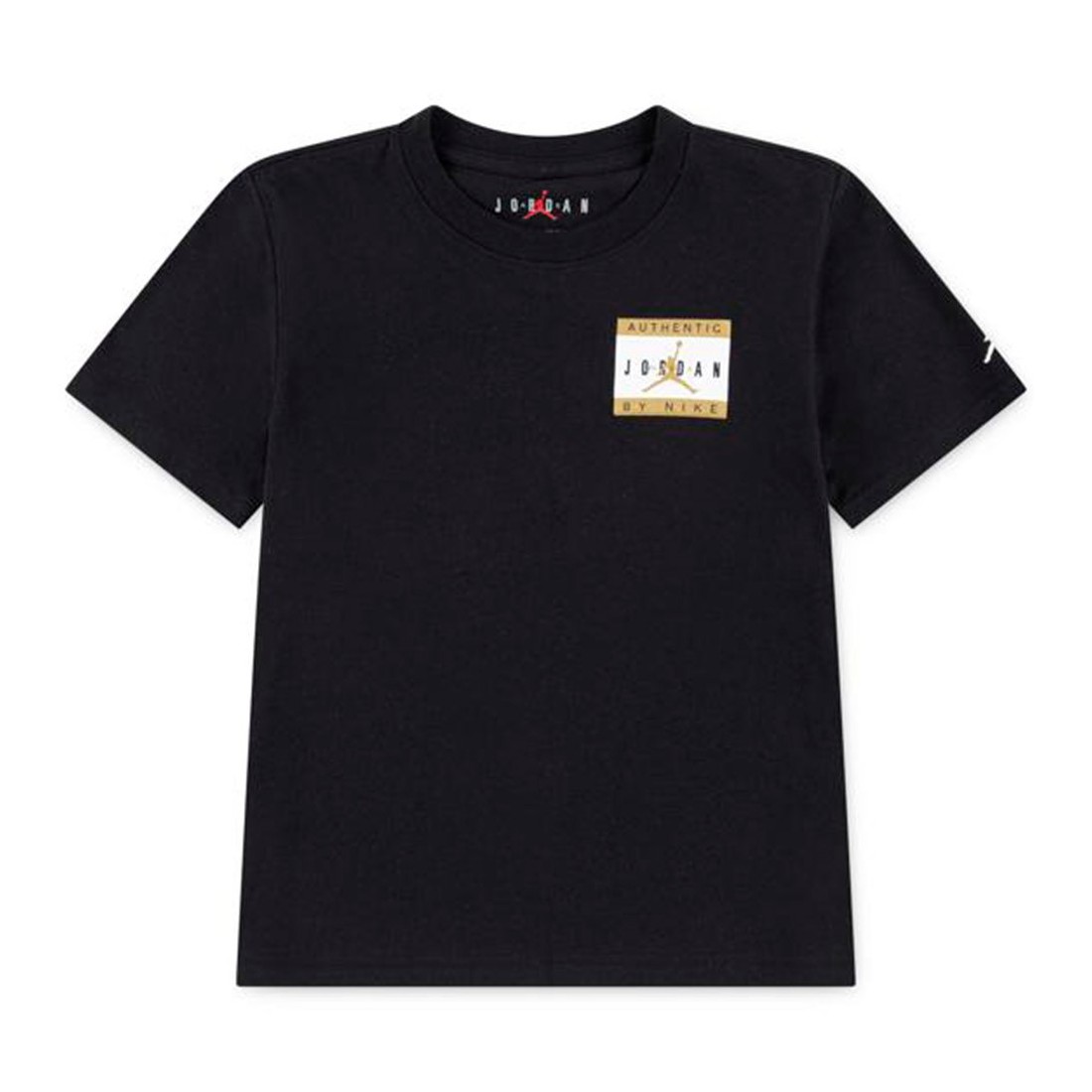 Camiseta Junior Jordan Printed Label Black. Representa la marca del vuelo con esta camiseta, confeccionada en jersey de algodón mezclado con una silueta de manga corta y un cuello redondo sin etiqueta para un ajuste cómodo.