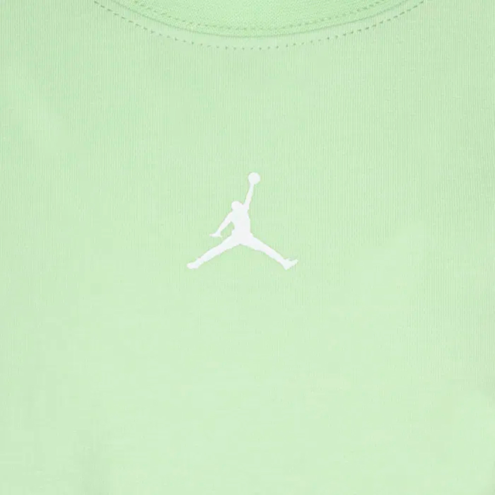 Camiseta Junior Jordan Sport Code Vapor Green. La camiseta Jordan Sport Code combina estilo urbano con funcionalidad técnica pensada para uso diario. Confeccionada en tejido de punto ligero con una mezcla que favorece la ventilación, ofrece frescura y sensación cómoda durante todo el día. Su corte juvenil (junior) ofrece un ajuste moderno que no queda ni muy holgado ni muy ceñido, ideal para acompañar movimiento. El diseño incorpora un gráfico llamativo con el nombre del jugador o la línea de firma, junto al logo Jumpman en un lugar visible. Los ribetes de cuello y mangas están reforzados para mantener la forma tras múltiples lavados.
