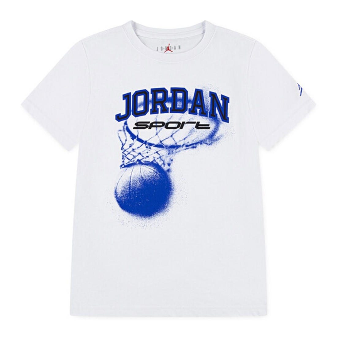 Camiseta Junior Jordan Sport Hoop White. Esta camiseta junior Jordan es una prenda diseñada para los pequeños aficionados con estilo y comodidad. Confeccionada en una suave mezcla tejidos, ofrece ligereza y frescura para el uso diario o en el recreo. Se acompaña de un gráfico central que refleja la estética moderna y el legado de la marca Jordan. El cuello redondo y el corte estándar garantizan un ajuste relajado, ideal para moverse con total libertad.