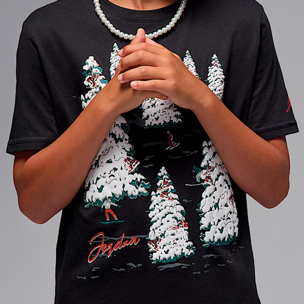Camiseta Junior Jordan Winterland Black. Esta camiseta junior Jordan presenta un diseño especial con un estampado que evoca ambientes invernales y añade carácter a un estilo casual. Está fabricada en 100 % algodón, lo que aporta suavidad, frescura y una sensación agradable al contacto con la piel. Su corte juvenil (regular fit) permite un ajuste cómodo que no limita el movimiento, ideal para el día a día.
