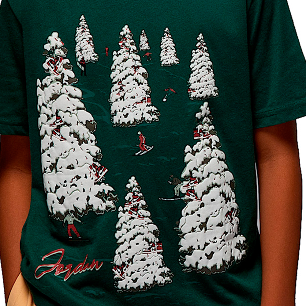 Camiseta Junior Jordan Winterland Green. Esta camiseta junior Jordan presenta un diseño especial con un estampado que evoca ambientes invernales y añade carácter a un estilo casual. Está fabricada en 100 % algodón, lo que aporta suavidad, frescura y una sensación agradable al contacto con la piel. Su corte juvenil (regular fit) permite un ajuste cómodo que no limita el movimiento, ideal para el día a día.