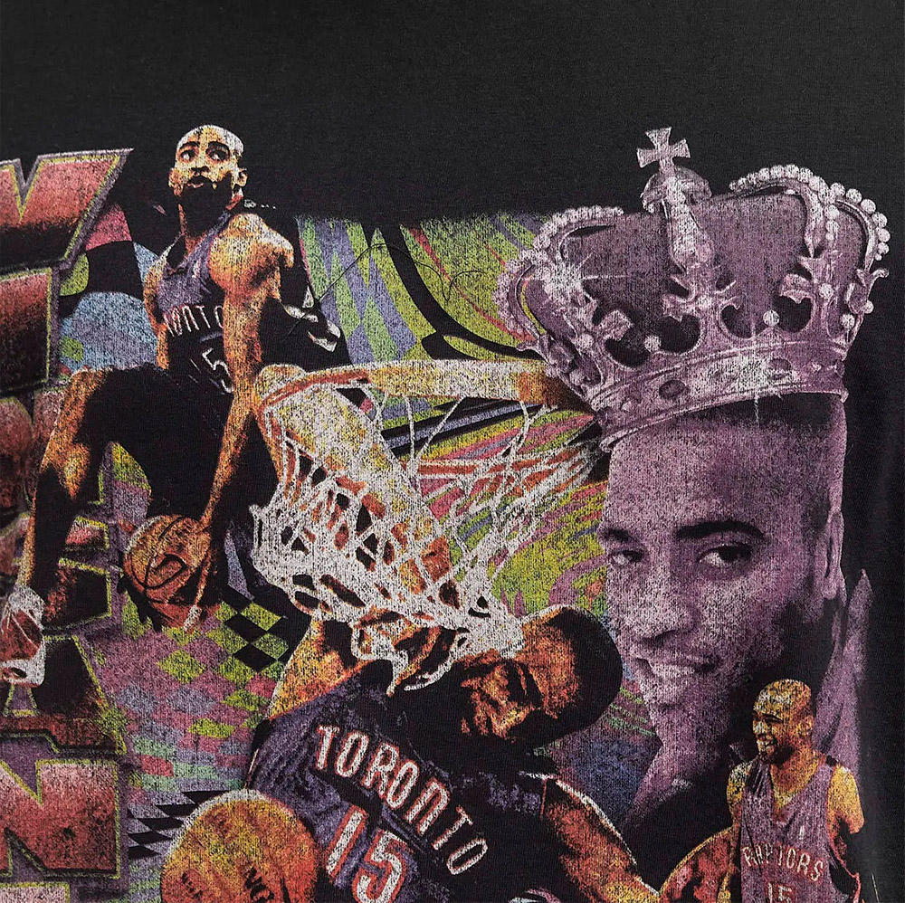 Camiseta Vince Carter Bootleg Graphic Black. Esta camiseta es una prenda de estilo urbano que destaca por su diseño contemporáneo con uno de los jugadores más carismáticos del siglo XXI: Vince Carter y materiales de calidad. Confeccionada en 100% algodón, ofrece una sensación suave y cómoda al tacto, ideal para el uso diario. Su corte regular y cuello redondo proporcionan un ajuste clásico que se adapta a diversas siluetas. El diseño en color negro se complementa con detalles gráficos que aportan un toque distintivo y moderno.