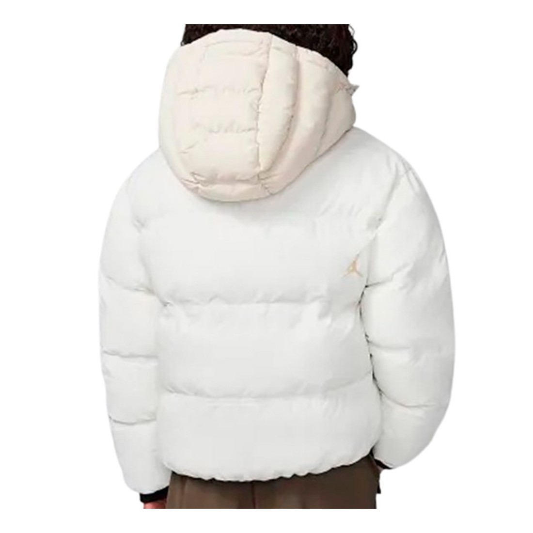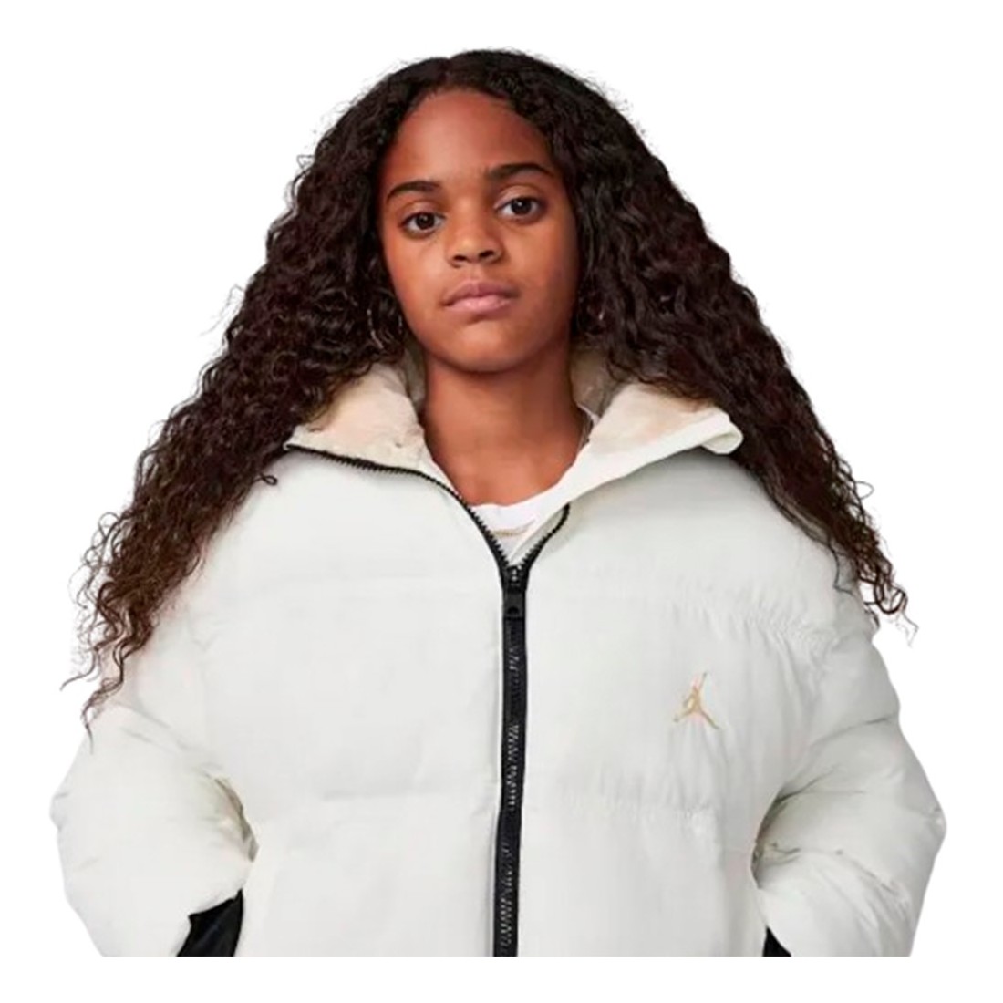 Chaqueta Chica Jordan Heaviest Puffer White. Esta prenda acolchada es cómoda y versátil. Está confeccionada con un tejido Woven de nylon con costuras acolchadas por toda la prenda y cuenta con un suave relleno de plumón sintético para ofrecer calidez y comodidad. Los hombros caídos crean un ajuste holgado, con un corte amplio y un cierre de cremallera completa para que sea fácil de combinar con otras prendas. Las mangas cuentan con puños interiores de punto elástico para retener la calidez.