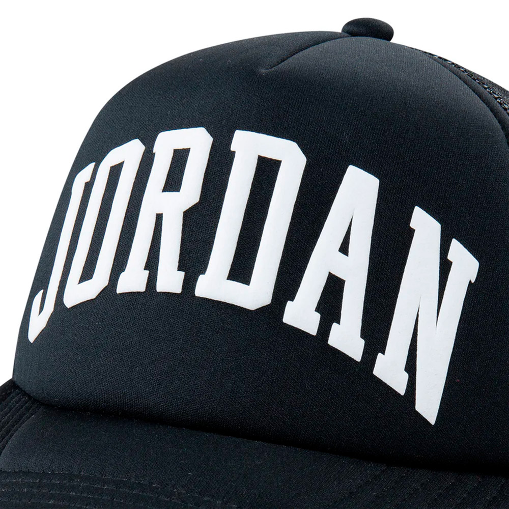 Gorra Junior Jordan Foam Trucker Black. Con un logotipo textual texturizado, esta es una clásica gorra de rejilla al estilo Jordan. La confección de seis paneles cuenta con una parte delantera de espuma de poliéster y cuatro paneles de malla transpirable.