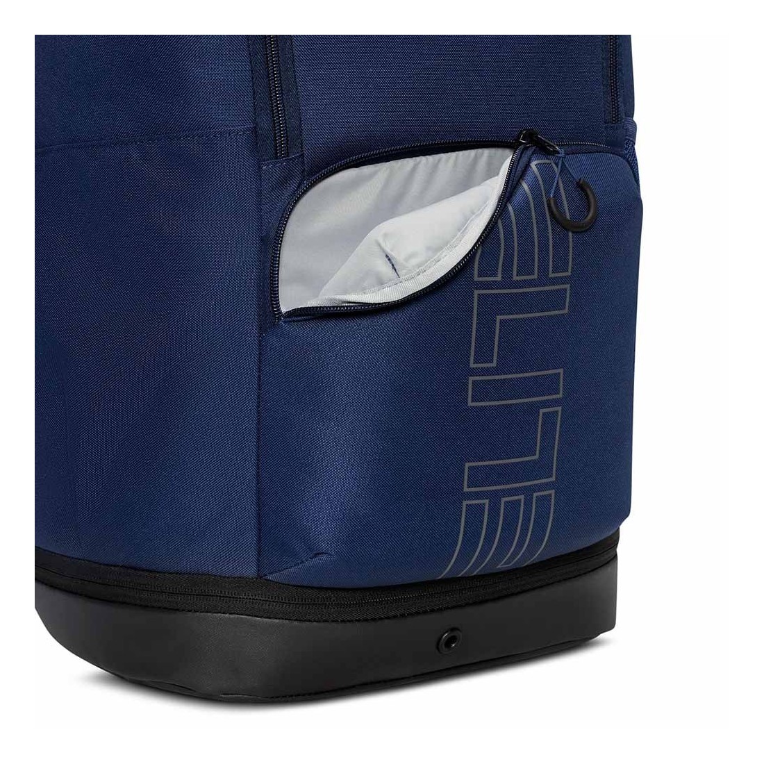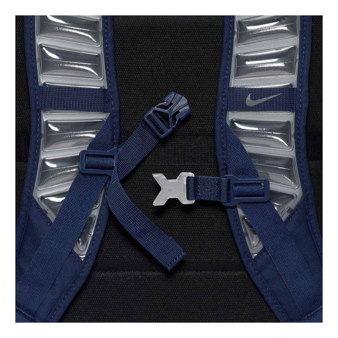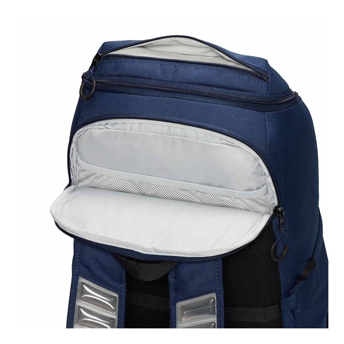 Mochila Nike Varsity Elite 32L Backpack Midnight Navy. La Nike Varsity Elite Backpack es una mochila premium de 32 litros, diseñada para llevar todo lo necesario para entrenar o viajar. Cuenta con un compartimento principal lo suficientemente grande para una pelota oficial. Incluye un bolsillo inferior ventilado ideal para zapatos o ropa húmeda y uno frontal de fácil acceso para guardar objetos pequeños. Las correas acolchadas con tecnología Air Max proporcionan comodidad al transportar cargas pesadas, mientras que el bolsillo superior forrado protege dispositivos electrónicos.