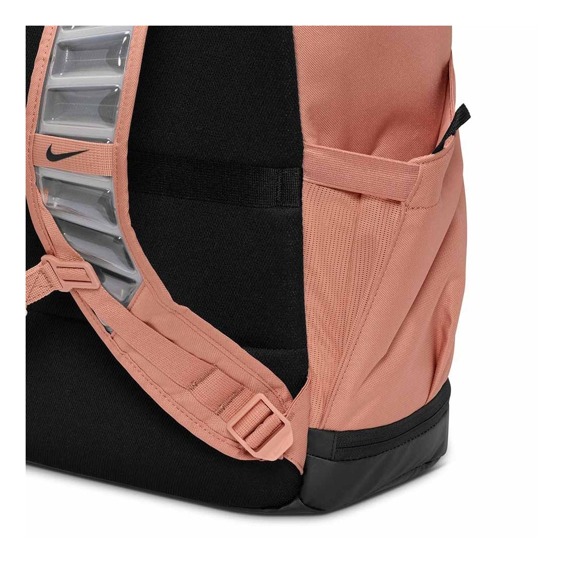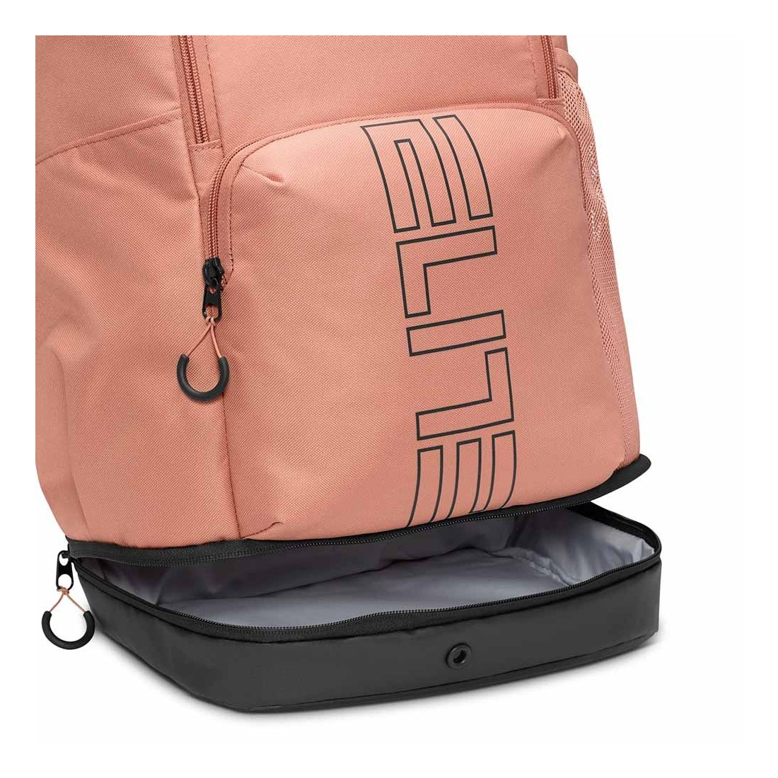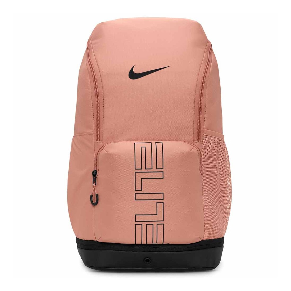 Mochila Nike Varsity Elite 32L Backpack Rose Gold. La Nike Varsity Elite Backpack es una mochila premium de 32 litros, diseñada para llevar todo lo necesario para entrenar o viajar. Cuenta con un compartimento principal lo suficientemente grande para una pelota oficial. Incluye un bolsillo inferior ventilado ideal para zapatos o ropa húmeda y uno frontal de fácil acceso para guardar objetos pequeños. Las correas acolchadas con tecnología Air Max proporcionan comodidad al transportar cargas pesadas, mientras que el bolsillo superior forrado protege dispositivos electrónicos.