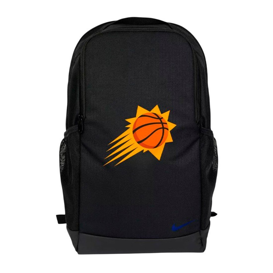 Mochila Phoenix Suns Logo Brasilia Black. Esta mochila es perfecta para los seguidores del equipo. Confeccionada en poliéster resistente, ofrece durabilidad y ligereza para el uso diario. Sus correas acolchadas y regulables aseguran un ajuste cómodo y adaptado a su crecimiento. Incluye un amplio compartimento principal con cremallera, ideal para libros, ropa deportiva y accesorios. En los laterales, dos bolsillos de malla permiten llevar botellas o pequeños objetos de forma accesible.