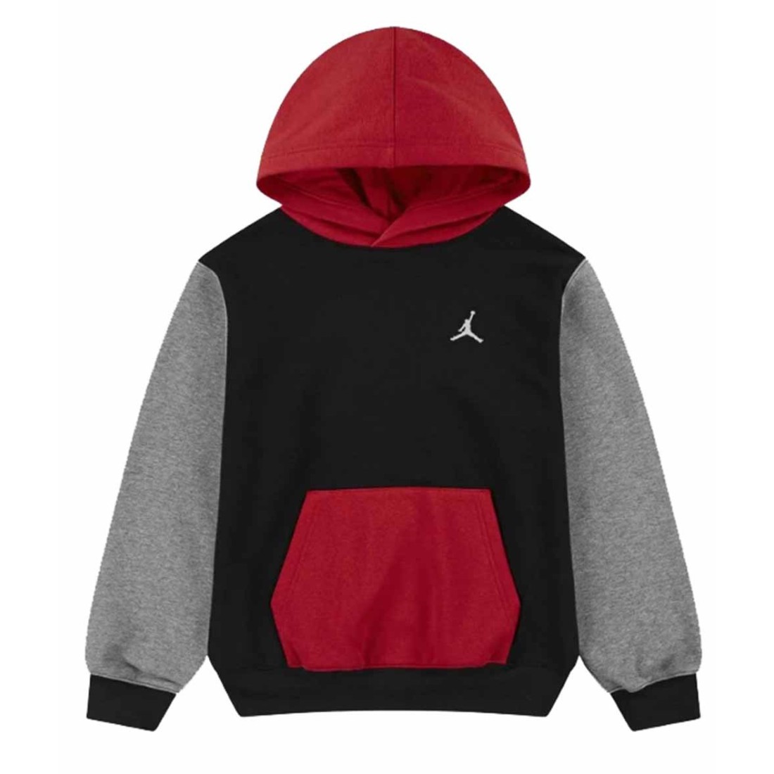 Sudadera Junior Jordan FT Pullover Hoodie Black Gym Red. La sudadera Jordan FT Pullover Hoodie para juniors es una combinación ideal de estilo urbano y confort. Confeccionada en mezcla de algodón y poliéster, presenta un interior semiceps que proporciona calidez ligera manteniendo una sensación suave al tacto. Ofrece un ajuste relajado gracias al corte holgado, ideal para capas bajo prendas mayores o para llevarla sola. Viene con capucha fija y bolsillo tipo canguro frontal para funcionalidad diaria, ya sea para calentar manos o guardar objetos esenciales. Los puños y el bajo acanalados aseguran un ajuste firme sin perder forma tras los lavados.