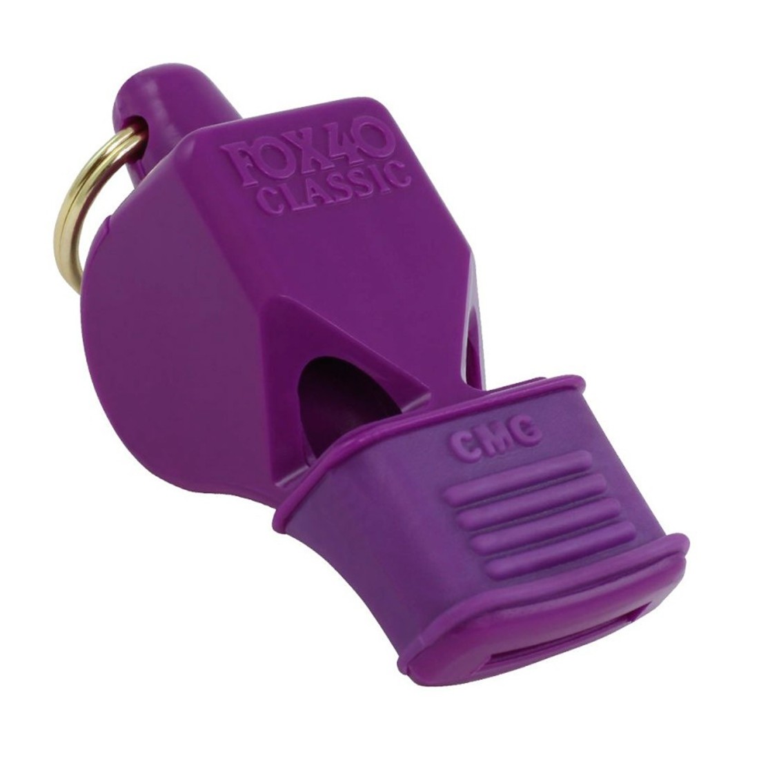 Fox Sifflet 40 Classic CMG Purple . Ce sifflet est doté d'une embouchure CMG (Cushioned Mouth Grip), dont les zones de préhension permettent de maintenir le sifflet en place pendant l'utilisation.