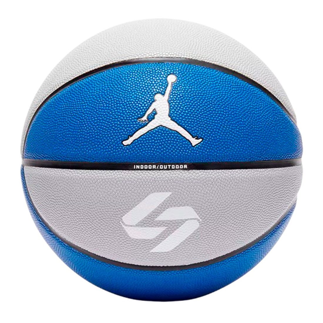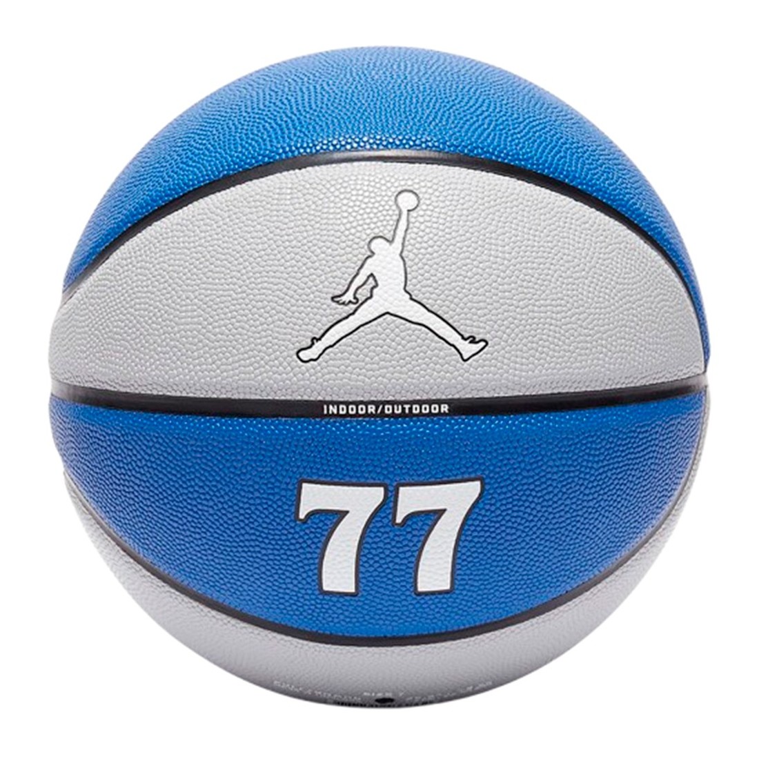 Jordan Luka Doncic All Court 8P Deflated Blue Grey Sz7. This ball is a versatile and durable option for basketball fans looking for quality and style. Made with a durable rubber cover, this ball is designed for optimal performance on both indoor and outdoor courts. Its textured surface provides exceptional grip, facilitating control and accuracy with every pass and shot. The 8-panel design and deep channels improve the ball's manoeuvrability, adapting to the demands of different playing surfaces. In addition, its striking royal blue colour with black and white details, along with Luka Dončić's logo, gives it a distinctive and modern look.