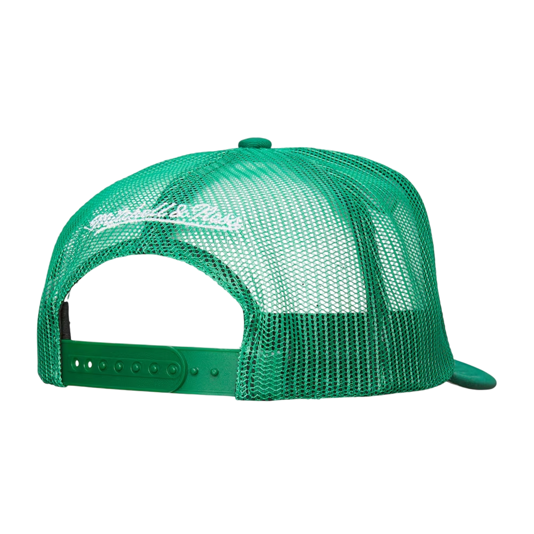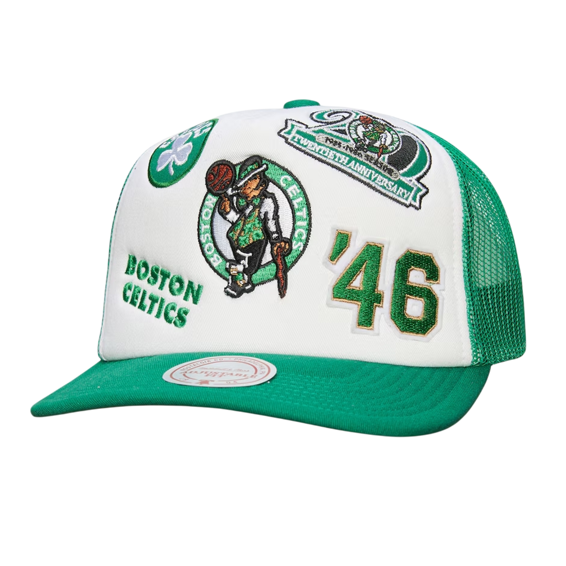 Boston Celtics Gridlock Trucker White Green cap. A classic and elegant style cap, perfect for fans of the team. Made of 100% polyester, it offers durability and comfort. It features the official Boston Celtics logo embroidered on the front and the New Era logo on the left side, adding authenticity to the design. The full, structured crown maintains the shape of the cap, while the flat bill adds a modern touch. Available in a range of sizes, this cap fits a variety of head sizes. Perfect for showing off your Celtics passion for any occasion.