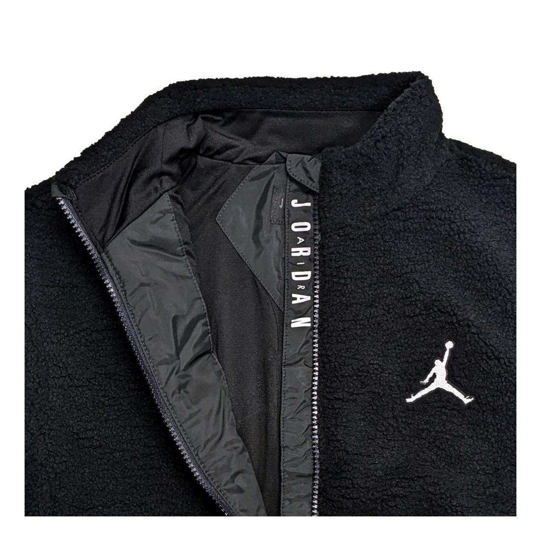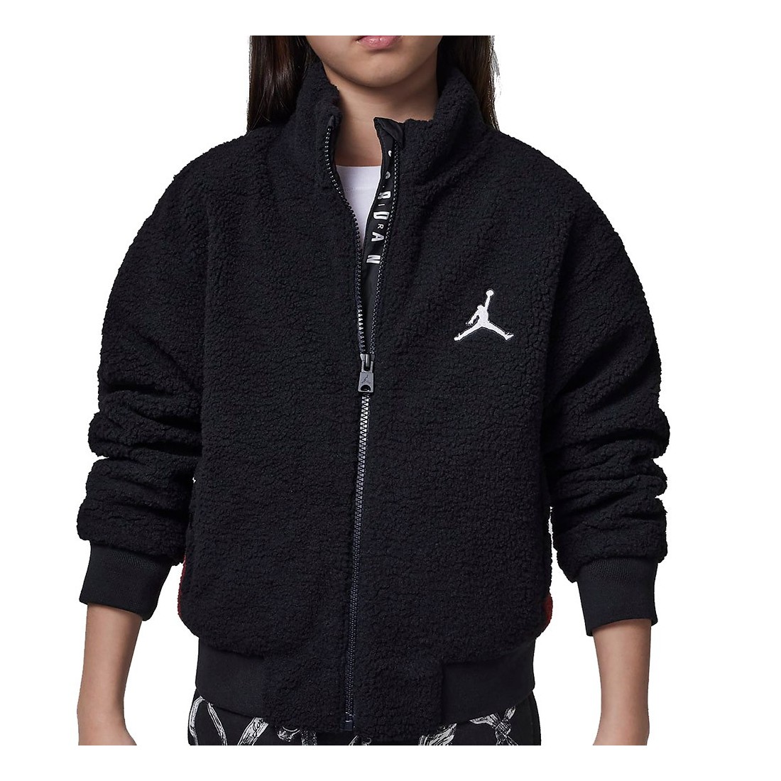 Girl Jordan Jumpman Sherpa Black Jacket. Made from soft, long-pile fabric, this cozy Jordan jacket feels like you're wrapped in your favorite blanket. It features a full zip, a high collar that doubles as a scarf, and dropped shoulders create a relaxed fit.