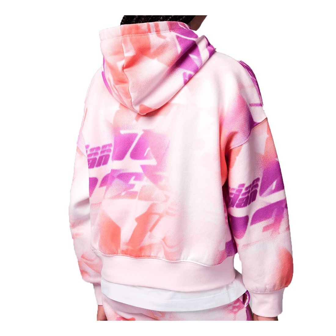 Girl's Hoodie Jordan Triple Team Printed AOP Artic Pink. Take a leap into unrivalled style with this hoodie in a lovely Arctic Pink colourway. Designed especially for those looking for a warm, personality-filled outfit, this sweatshirt is more than just a garment - it's a fashion statement that reflects a bold spirit.