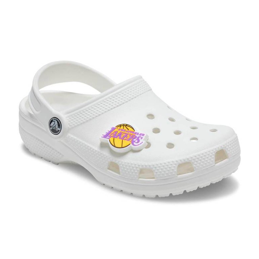 Jibbitz Los Angeles Lakers Clip Crocs. Set the trend this season with this shoe clip from Crocs. It is carefully crafted using high quality PVC. This multi-coloured shoe trim will give your shoes a distinctive style. Compatible with a wide range of shoes, this shoe trim will be a great way to show off your personality.