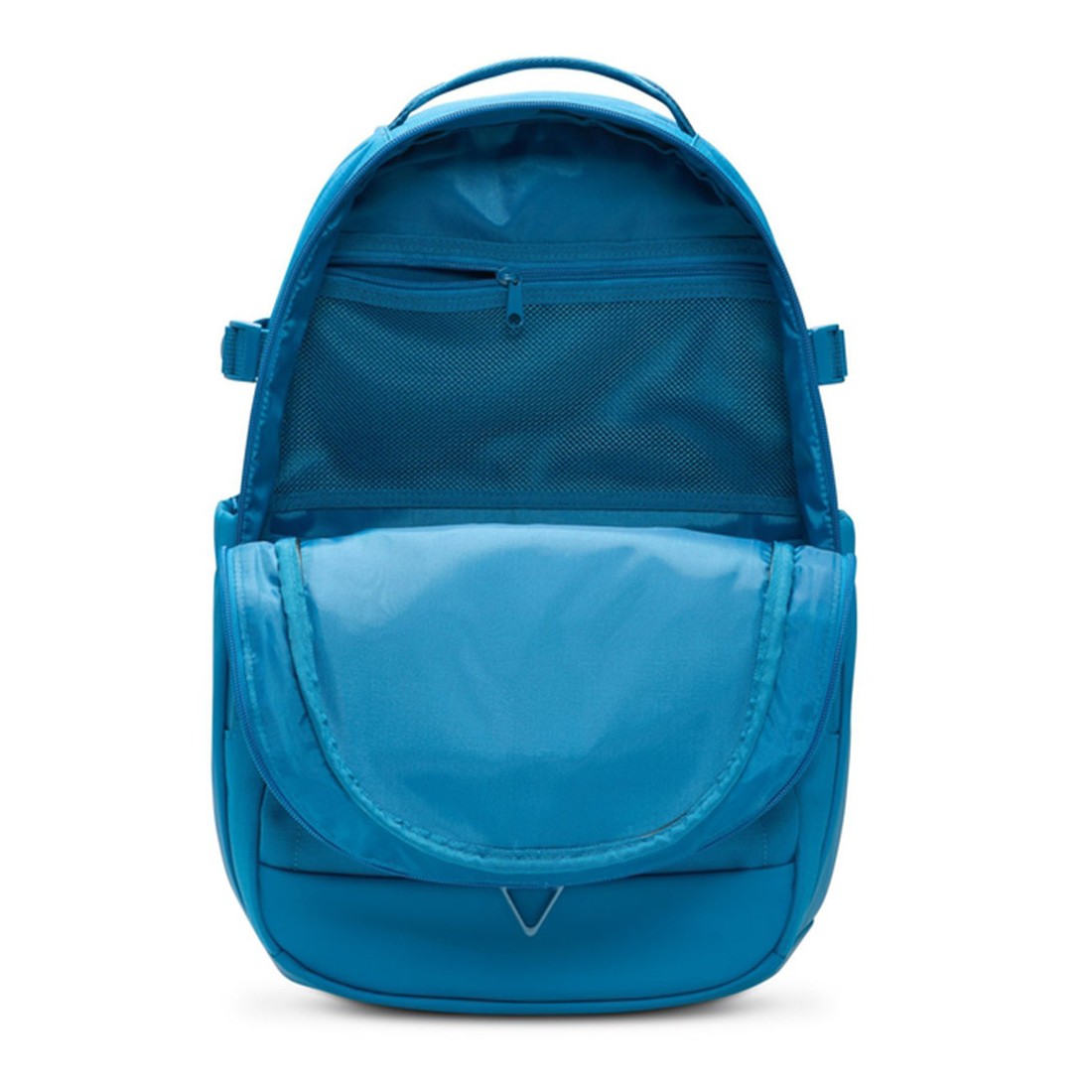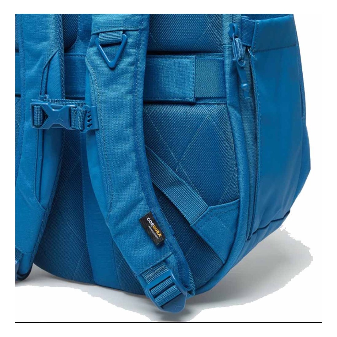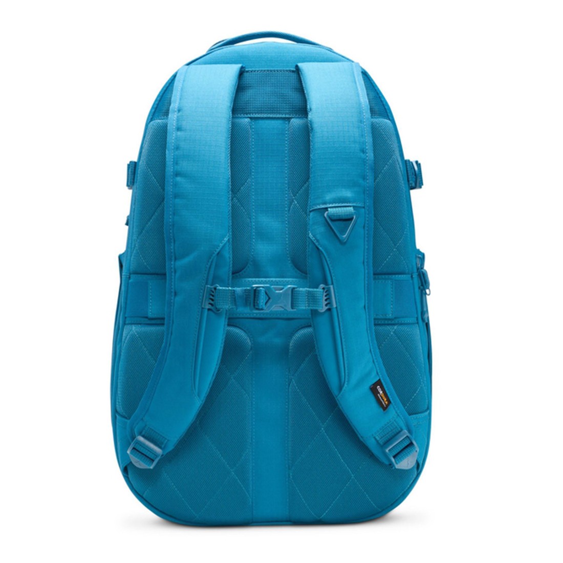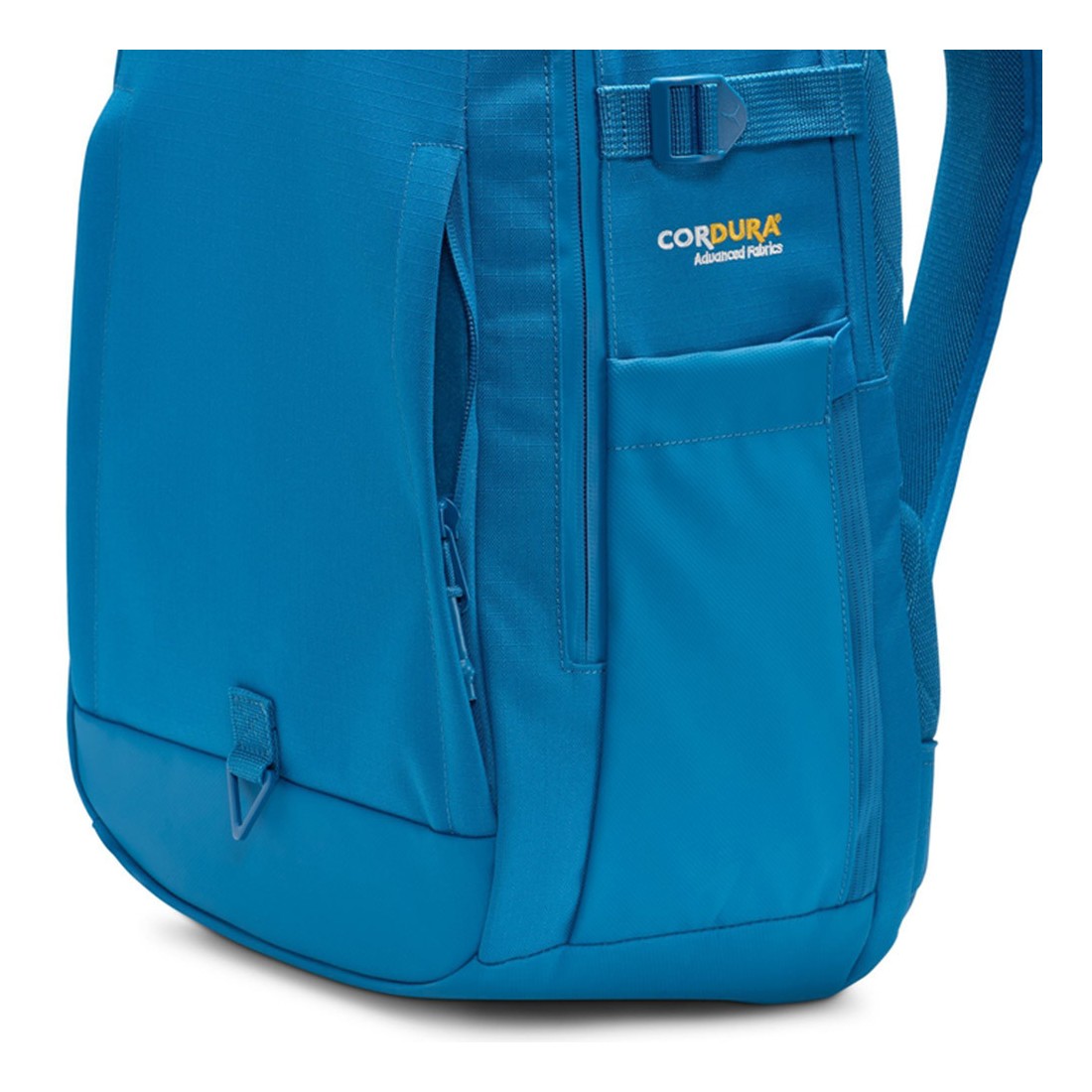 Jordan Cordura Franchise Industrial Blue Backpack. What is the secret ingredient in this backpack? It's made with durable CORDURA® ripstop fabric that's resistant to abrasions, tears, and bumps, plus a water-repellent finish that helps keep your belongings safe and dry. The two-way zippered main compartment is roomy enough to carry textbooks or a change of clothes for the gym or an overnight trip. The two-way zippered back panel contains an organizer with padded sleeves for laptops and tablets. Two large zipper pockets on the front hold small items you want to access easily, and the side pockets can store your favorite bottles.