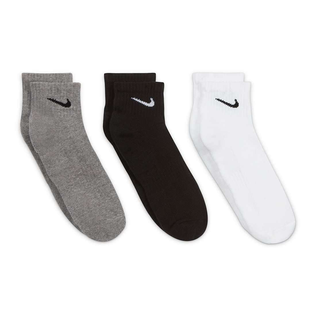 Socks Nike Everyday Cushioned Ankle Grey Black White 3pk. These Nike Everyday Cushioned socks offer a thick French terry knit sole for extra comfort during training and matches, while the foot is wrapped by an elastic band at the bridge to provide a supportive fit.