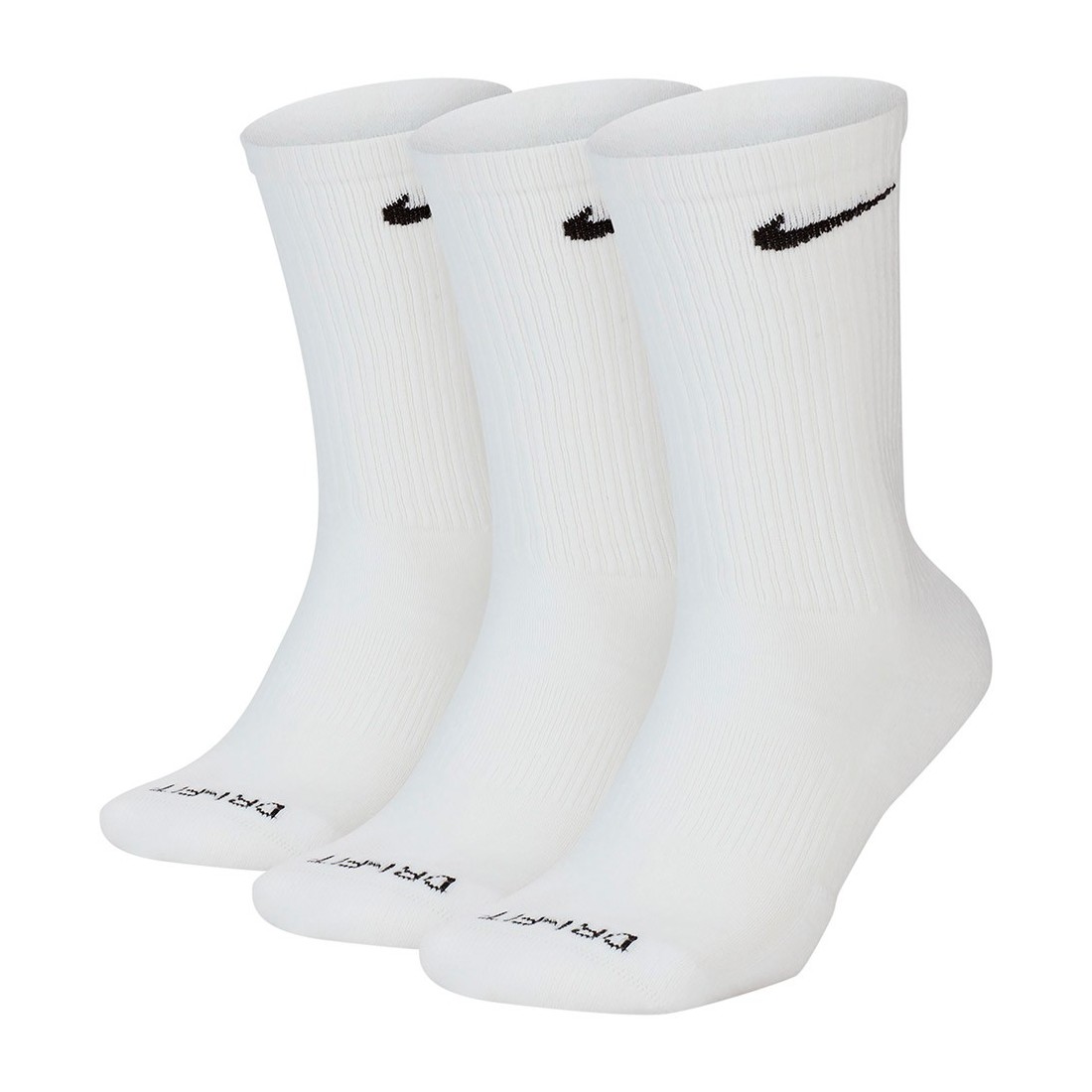 Socks Nike Everyday Plus Cushioned Crew White 3pk. The Nike Everyday Plus socks provide comfort with extra cushioning under the heel and forefoot and a snug, supportive arch band. Sweat-wicking technology and breathability in the upper help keep feet dry and cool to help you get through that extra game.