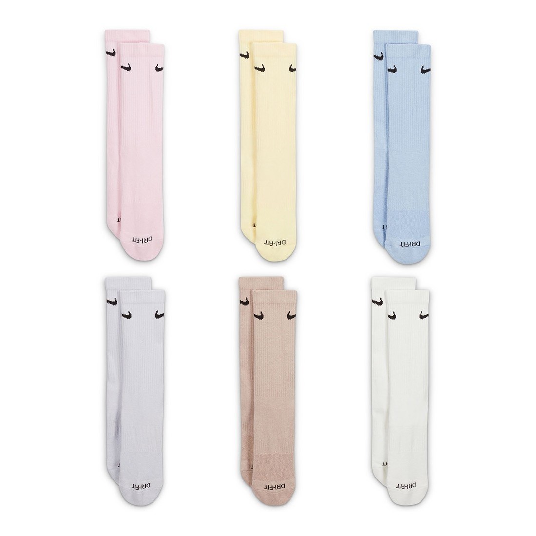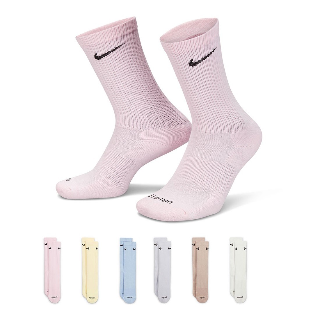 Calzini Nike Everyday Plus Cushioned Training Crew Multi Pastel 6PK. I calzini da allenamento Nike Everyday Plus Cushioned offrono comfort all'allenamento grazie a un'ammortizzazione extra sotto il tallone e l'avampiede e a una fascia aderente con supporto all'arco del piede.