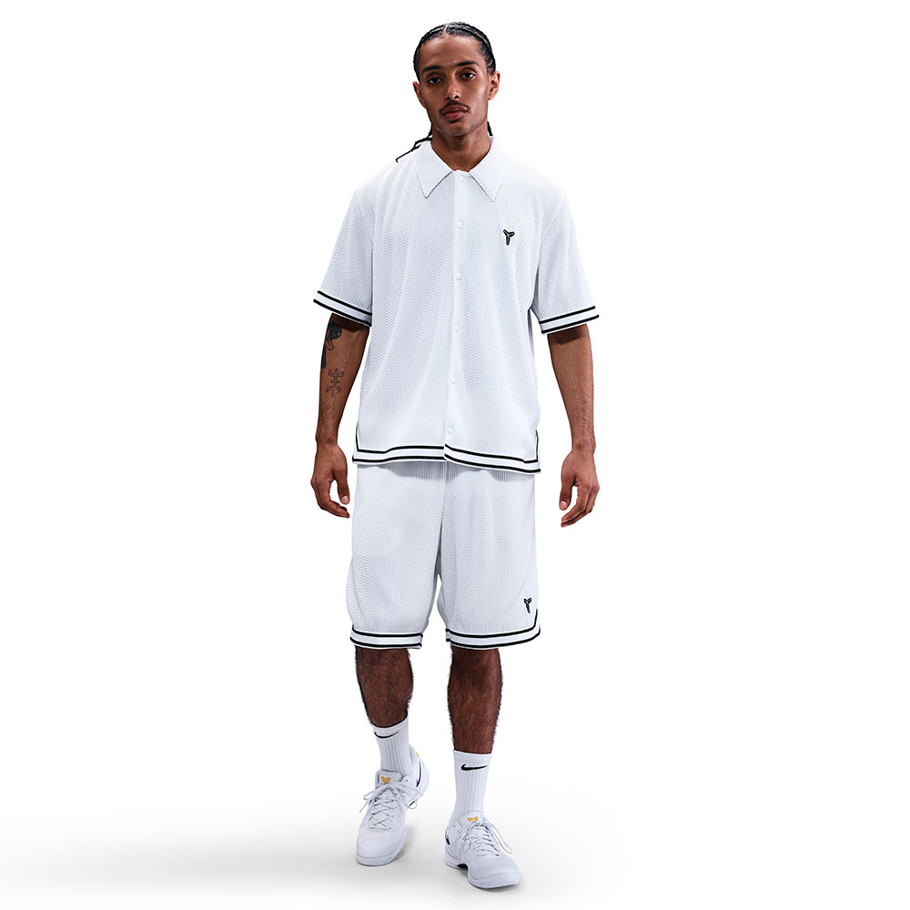Camicia Nike Kobe Pleased White. Trasmettete lo spirito del Mamba con questa camicia a rete plissettata ispirata a Kobe. Con una sensazione ultra-traspirante e un design con bottoni a pressione, questo modello vi mantiene freschi e comodi mentre praticate il vostro sport preferito.