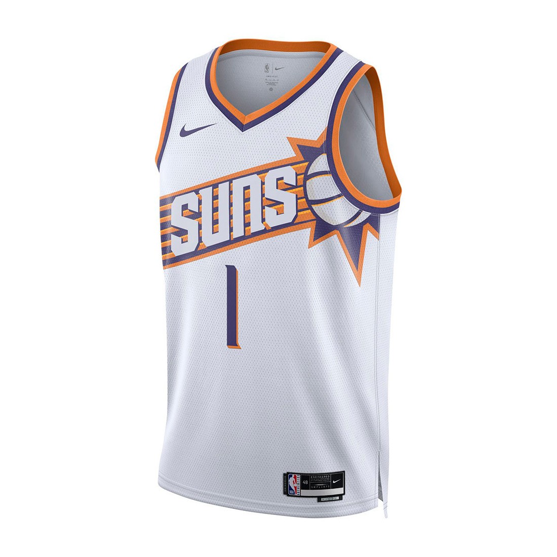 Devin Booker Phoenix Suns 23-24 Association Edition Swingman. È il capo d'abbigliamento perfetto per ogni fan della squadra. Progettata con i colori, i loghi e i dettagli di design che si abbinano all'abbigliamento ufficiale della squadra di NBA. Nike presenta questa maglia con i colori della franchigia in linea con la Icon Edition. Caratterizzata da una costruzione premium a doppia maglia e dalla tecnologia Dri-FIT, questo capo è ideale per fare il tifo e abbinarsi alla squadra in campo.