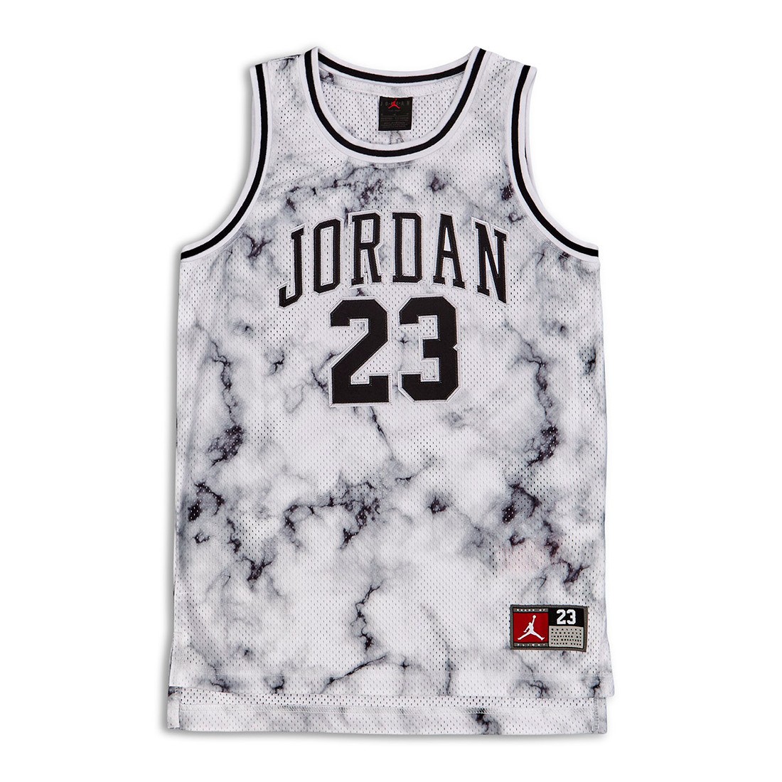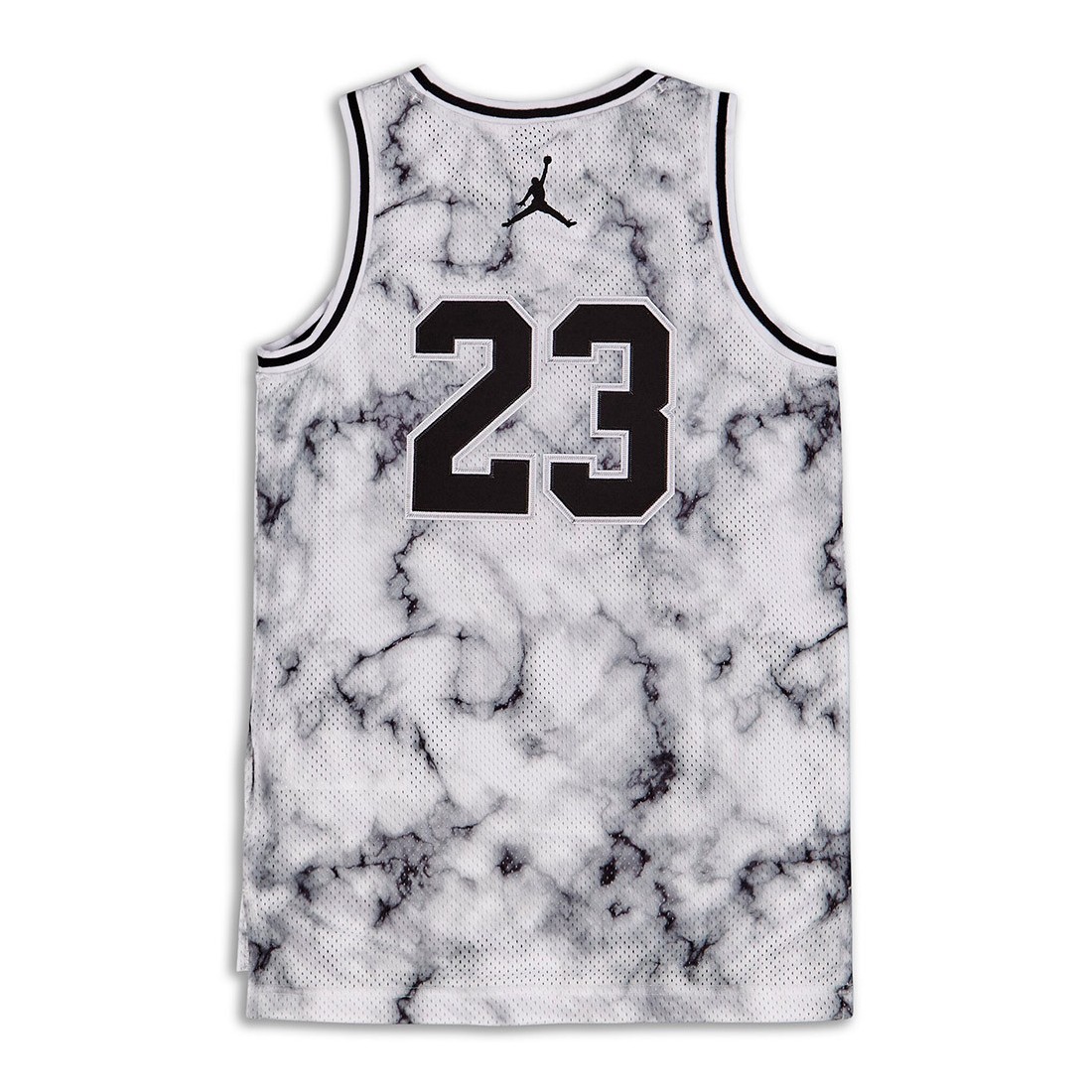 Jordan Maglietta junior 23 a righe bianche . Jordan La maglia junior di Michael con il numero 23 è realizzata con i materiali e le finiture dei suoi giorni di gioco. Jordan Jordan La maglia a maglia larga, il colletto a coste, il nome e il numero applicati a caldo e i dettagli ricamati ispirati a Michael e al marchio rendono questa maglia perfetta sia per il basket che per l'abbigliamento quotidiano.