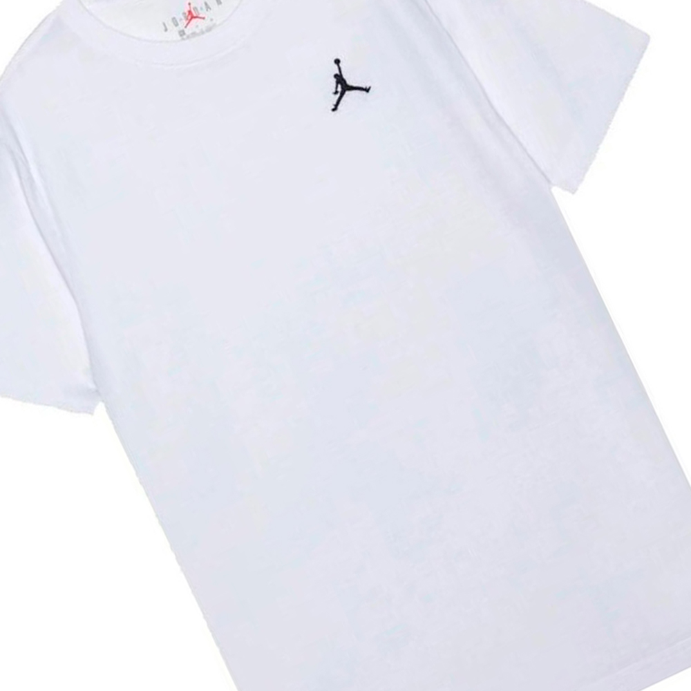 T-shirt Junior Jordan Jumpman Air ricamato bianco. la T-shirt Jumpman Air di Jordan unisce stile e comfort per i giovani appassionati di basket. Realizzata al 100% in cotone, è morbida e confortevole sulla pelle. Il design a girocollo a maniche corte presenta l'iconico logo Jumpman ricamato sul petto a sinistra, aggiungendo un tocco distintivo.