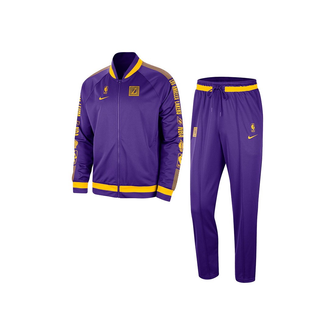Tuta da ginnastica Los Angeles Lakers Dri-FIT Starting 5 Junior. Questa tuta da ginnastica di Nike NBA è foderata con una confortevole rete e ornata da una combinazione di stampe e ricami, dettagli di piping e nastro grafico lungo le spalle. La combinazione di giacca e pantaloni è perfetta per l'allenamento, il riscaldamento o l'uso quotidiano.